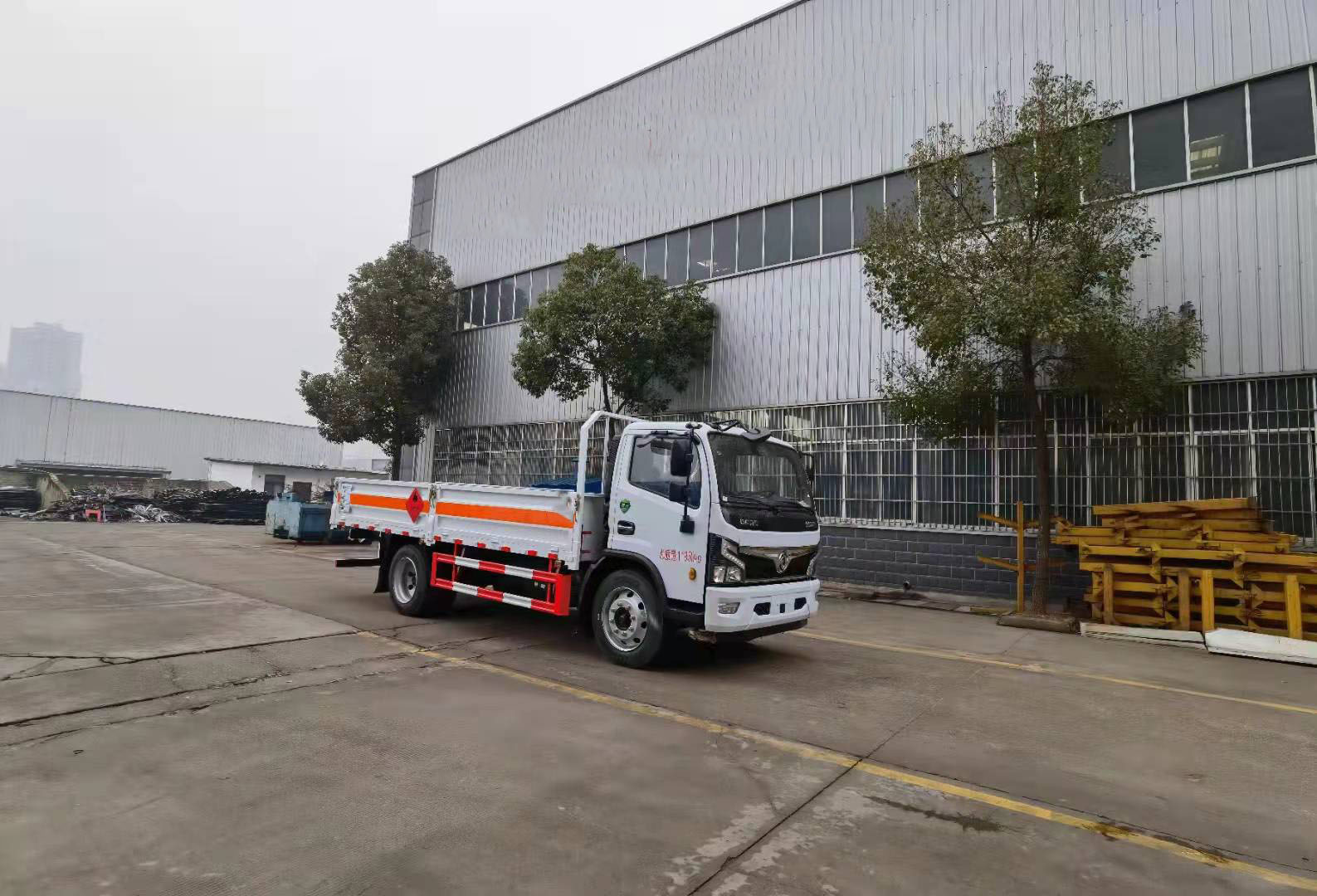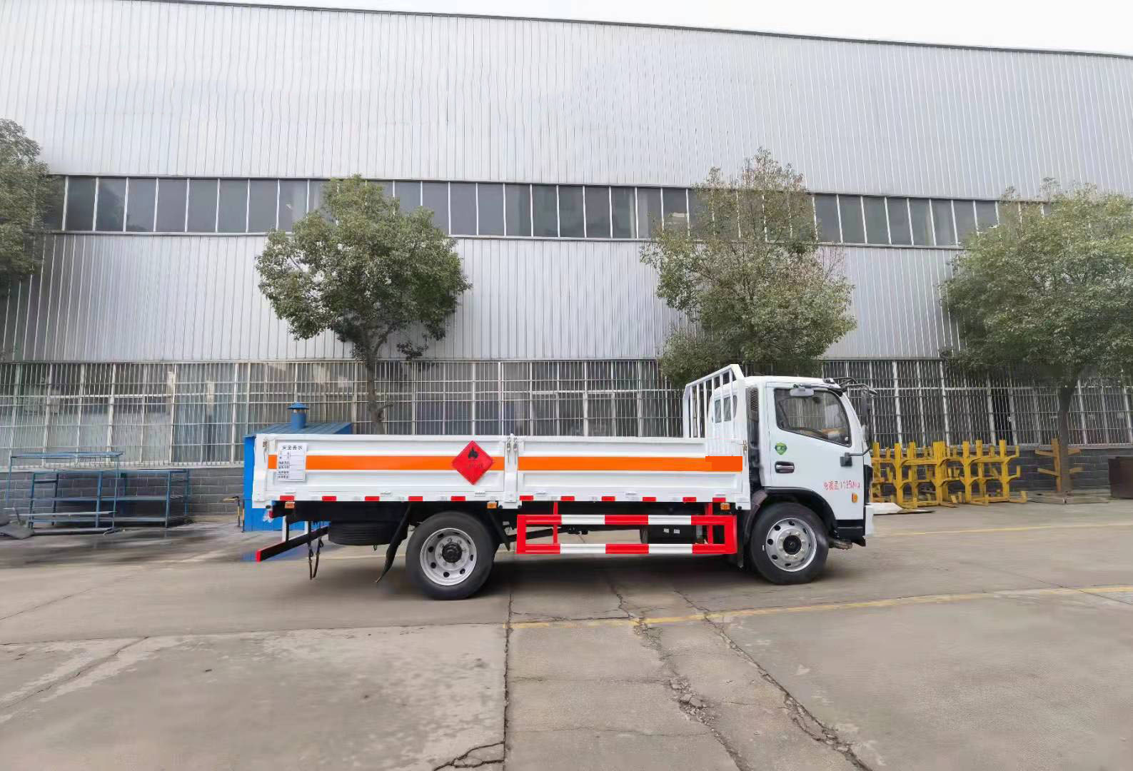 國六東風福瑞卡低欄氣瓶運輸車整車型號:CLQ5120TQP6E,底盤型號:EQ1125SJ8CDCWXP,軸距3800mm,發動機YCY30165-60(玉柴165馬力)/D30TCIF1(云內170馬力),6檔變速箱,245/70R19.5,前后橋2.7噸,后橋5.5噸,192雙層大梁,動轉,離合助力,排氣制動斷氣剎,空調電窗中控鎖,ABS.排氣管前置.電源開關,ECU限速,2021新規雙預警(前向碰撞預警系統FCWS,車道偏離報警系統LDWS)。整車尺寸:7010*2460*2520mm,貨箱尺寸:5200*2300*2200mm。廂體邊板采用1.2mm冷板,底板標配3mm花紋鋼板,底板上方鋪防靜電膠皮,選裝可拆卸高欄,活動立柱,底板做防銹處理。箱體采用雙組份丙稀酸油漆制作,所有合頁均為熱鍍鋅材質。選裝液壓升降尾板。整車國標反光標示及警告標志 (隨車工具,滅火器,三角頂燈,危險品標識,拖地靜電帶),其他按照公告標準制作。