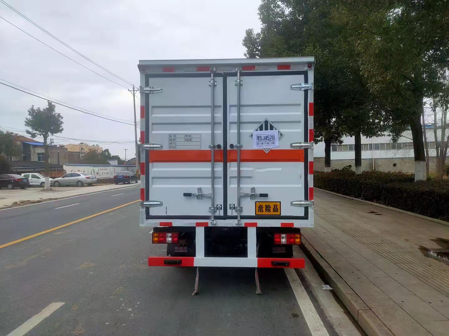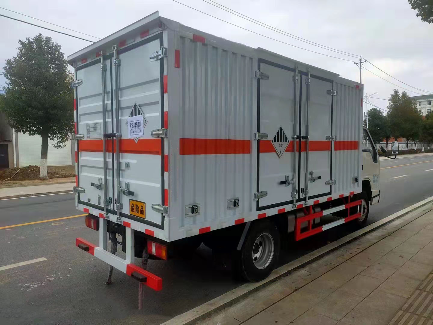 江鈴帶雙開側門國六瓦楞板危險品車箱體采用的是定制型的箱體,冷軋板折彎成瓦楞板,箱體防水淋雨測試全部通過。箱體底板采用的是3mm厚花紋板,底板上鋪設靜電膠皮,箱體內安裝有固定貨物的臥環。