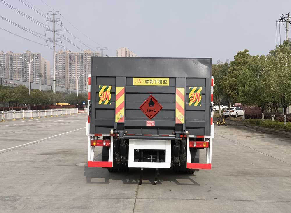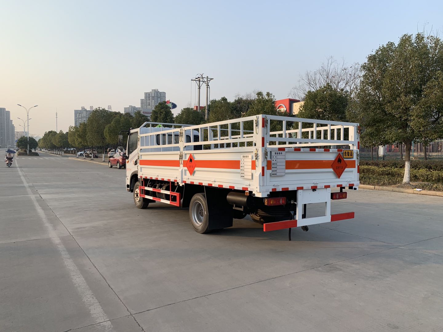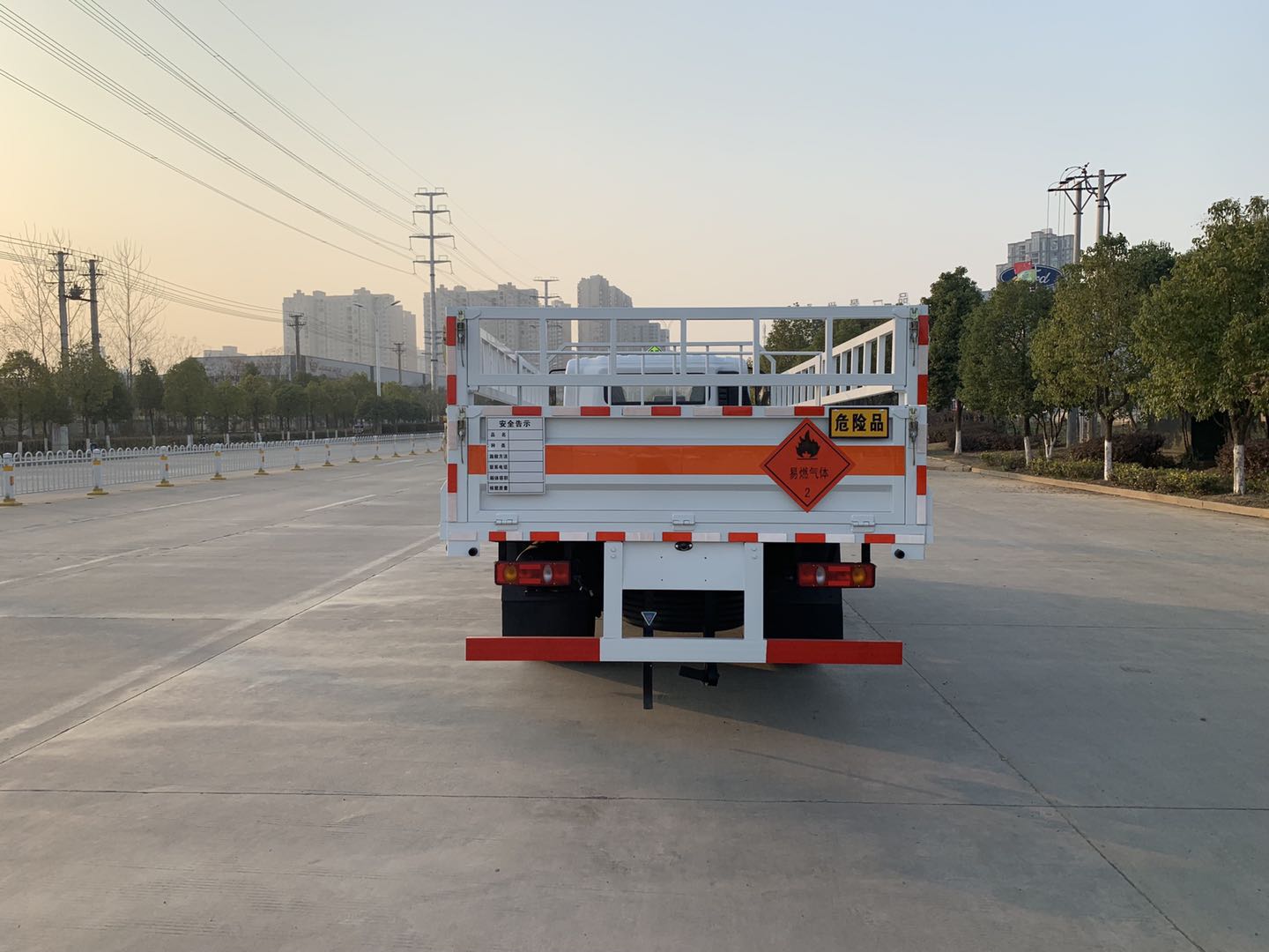 東風華神5米1國六氣瓶車廂體五開門,欄板內外飾均為冷軋鋼板,前龍門架。車廂底板采用4mm花紋鋼板并鋪設防靜電膠皮。帶靜電帶,滅火器,防火罩,危險品三角燈。法規反光標及危險品標識齊全。