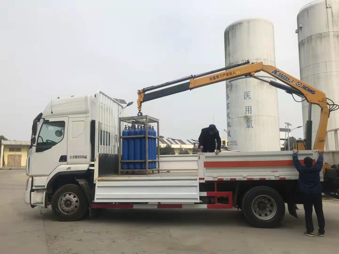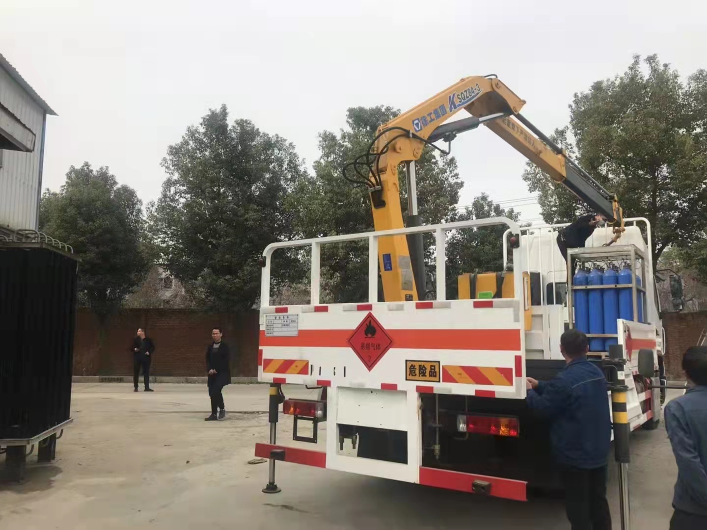 柳汽帶吊氣瓶車整車尺寸:9000×2550×2980mm,廂體尺寸:5600×2420×600mm。嚴格按照公告尺寸制作,底板采用5MM花紋板制作,底板上鋪靜電膠皮,低欄瓦楞式,配備滅火器,三角頂燈,靜電拖帶等,嚴格按照國家危險品法規進行“易燃氣體”標識粘貼等,帶徐工吊(4噸3節折臂)。