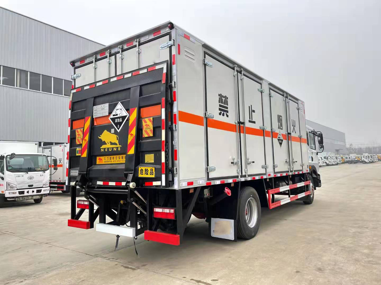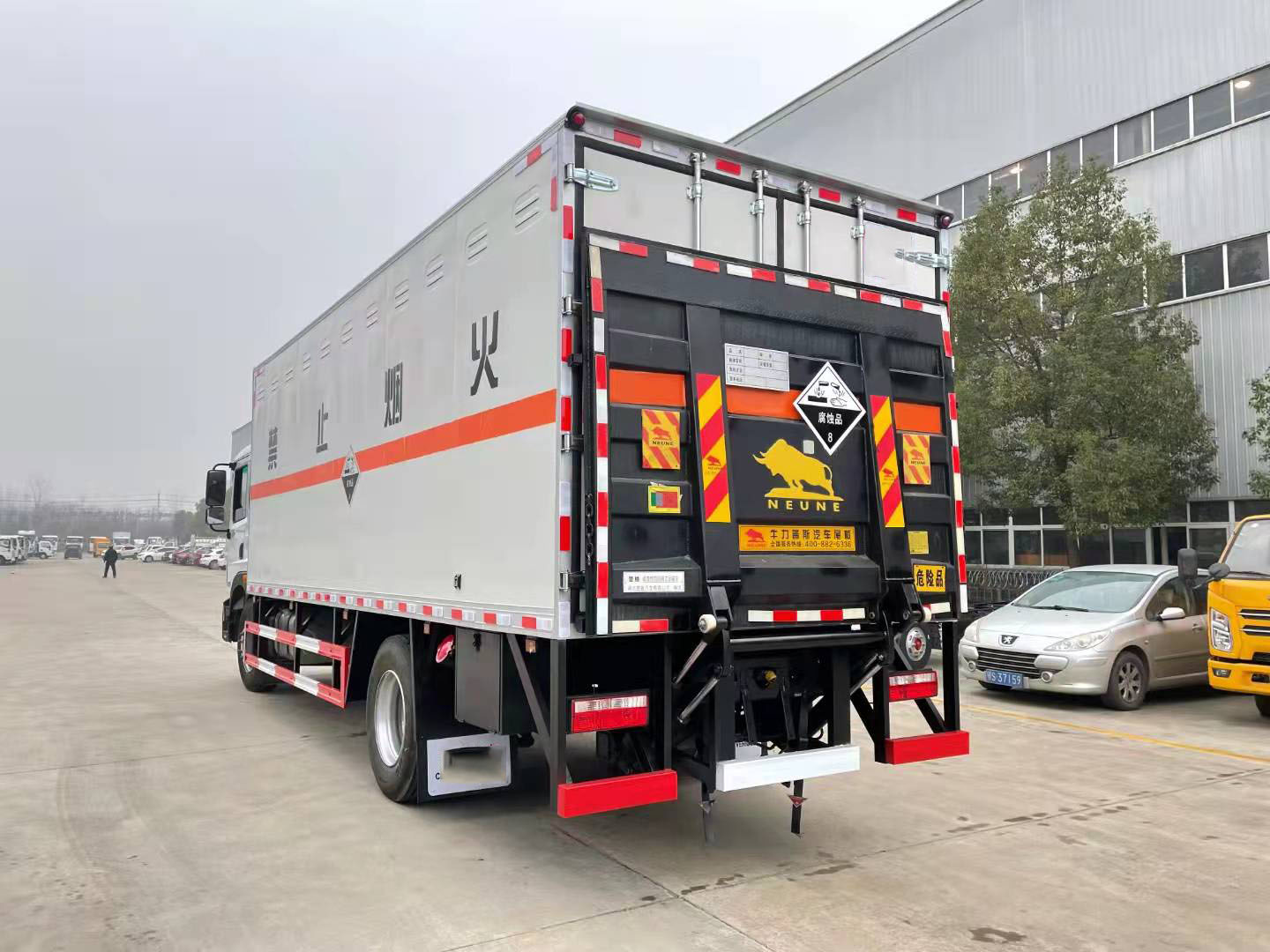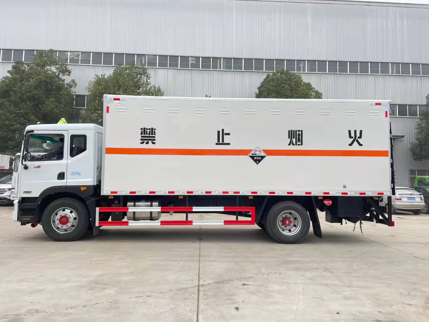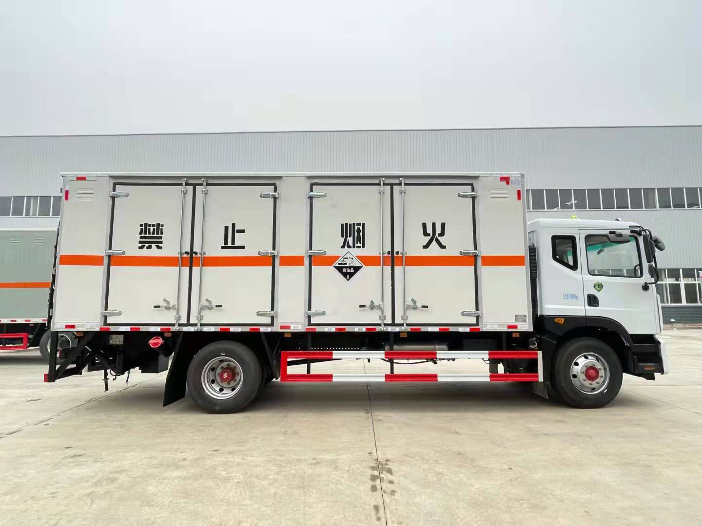 10噸腐蝕品廂式運輸車嚴格按照公告尺寸制作,外板采用1mm厚冷軋板有一次性成型的百葉窗,內飾為導電性能良好的鋁板有透氣孔,內襯為矩形管骨架牢靠穩定,內部填充為透氣防潮阻燃的擠塑板,四種材料經現代工藝復合而成,廂體外部上下鋁合金型材包邊,底板和車廂前下部鋪橡膠皮,后門雙開,右側中部雙開門,內部有固定貨物的臥環,車輛外部有靜電帶、滅火器、防火罩,車廂內安裝煙霧報警器和門防盜報警器,嚴格按照國家危險品相關法規張貼。