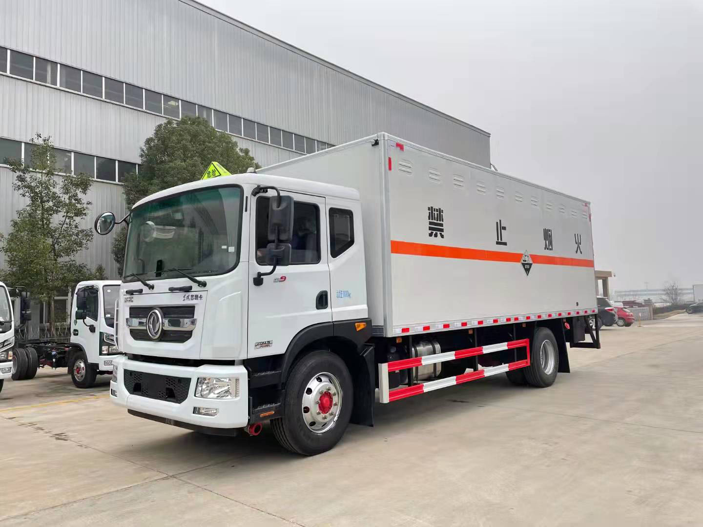 10噸腐蝕品廂式運輸車采用東風D9原廠危險品車底盤,康明斯220馬力發動機,帶ABS、原廠空調、排氣管前置、帶方向助力、限速裝置,帶安全帶未系提醒、剎車襯片預警提示、防爆胎裝置。