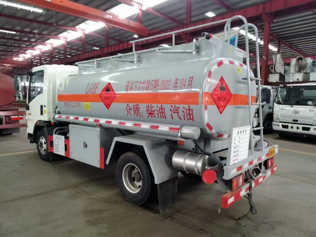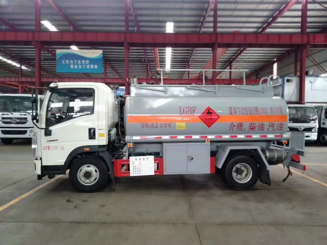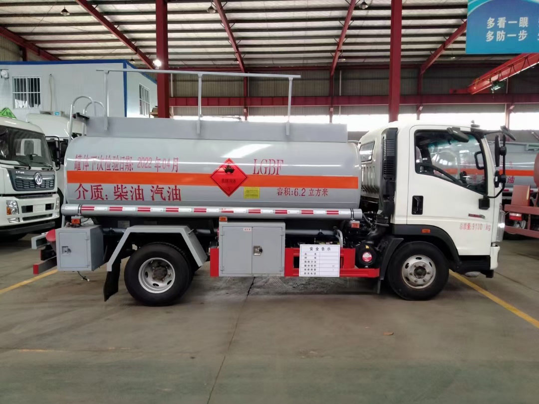 重汽豪沃加油車運輸介質:汽,柴油。公告容積6.2立方,總質量:9100kg ,額定載:4970kg,整備質量: 4000kg,罐體材料采用Q235碳鋼,5mm(≥4.2mm),單倉帶防浪隔板,帶輸油泵,可泵進泵出,全套歐標(一個歐標罐口,一個海底閥,下裝油口、廢氣回收、防溢流探桿及靜電插座),智能海底閥報警系統,一個工具箱,折疊護欄,罐尾一個爬梯,兩個反光板,一個防火帽,兩根與罐長等長輸油管,兩個滅火器,罐體防銹漆,貼3M牌反光條,反光帶,安全告示,三個“易燃液體”標。