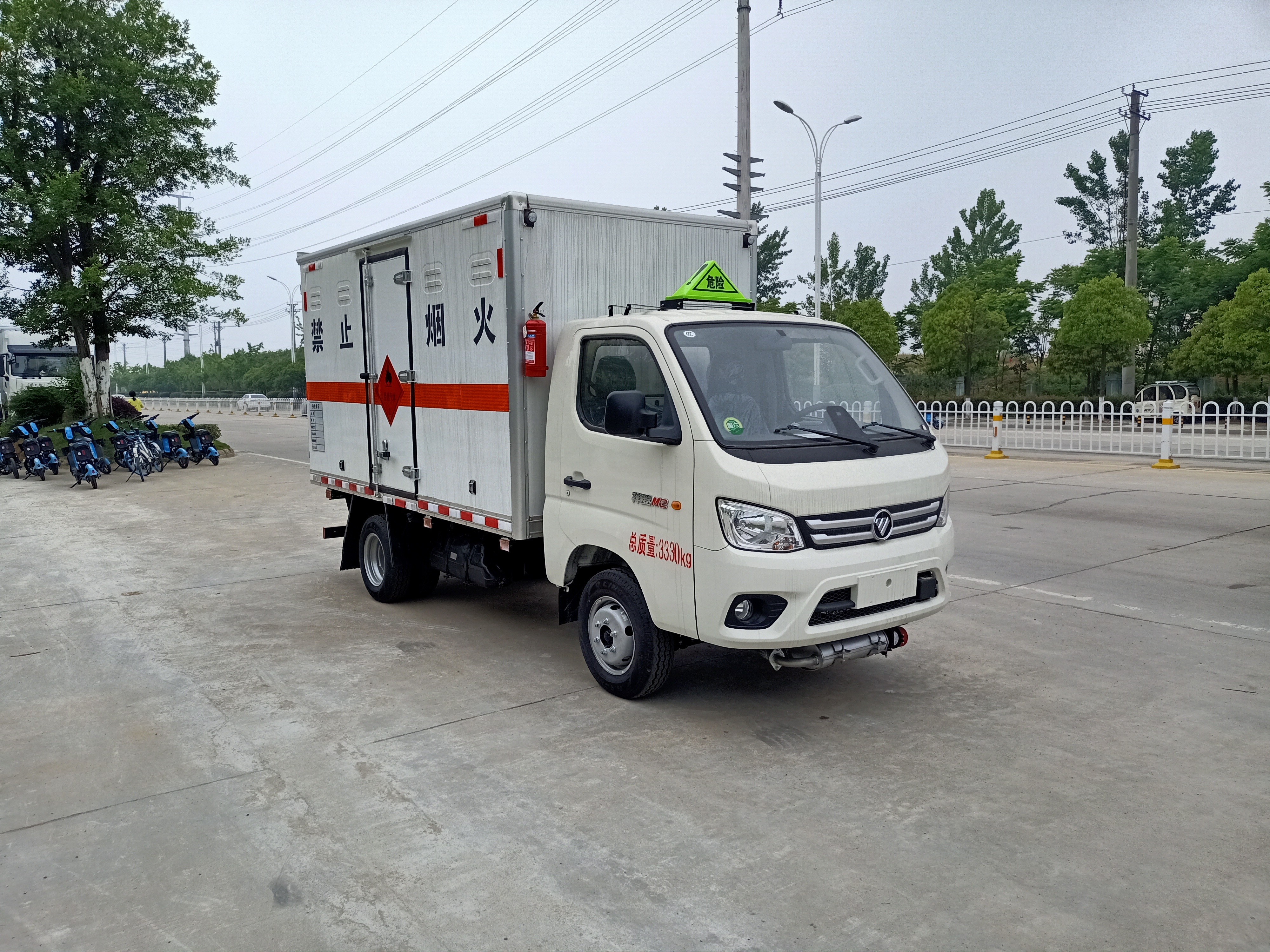 福田時代祥菱M2國六危險品車廂體為雙層金屬骨架結構,外冷軋鋼板內飾鋁板,內壁采用鋁合金板蒙面,夾層為隔熱阻燃材料填充,廂體內部做透氣網,中開側門,廂體內部做防靜電處理,廂體底部鋪導靜電膠板,車輛副梁配備導靜電帶,廂體內襯壁裝單排臥環,廂體內頂部安裝煙感報警器,廂體安裝防盜報警器。隨車配備手提滅火器,危險品三角頂燈,防護帽等,嚴格按照國家危險品法規進行標識粘貼等,其余廠家標配。