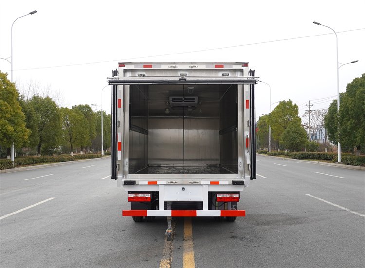 東風多利卡國六玉柴140馬力醫療廢物轉運車廂體保溫廂板外蒙皮為玻璃鋼板,內蒙皮為不銹鋼板,車廂內四周設置圓弧型不銹鋼及轉角,消毒和清洗時無清理死角。保溫層為硬質聚氨酯泡沫; 廂體為全密閉型,后門為雙層密閉結構(設置雙后門和內開門兩層門)確保廂體內盛裝的垃圾醫療與外界的隔斷,醫療廢物轉運車車廂分為貨物盛裝倉和醫用物品放置倉,在醫用物品放置倉外部(副司機方)開設單側門,方便醫用和醫療器械的存放, 醫療廢物轉廂體前、后和兩側設有醫療廢物和警識標識,駕駛。