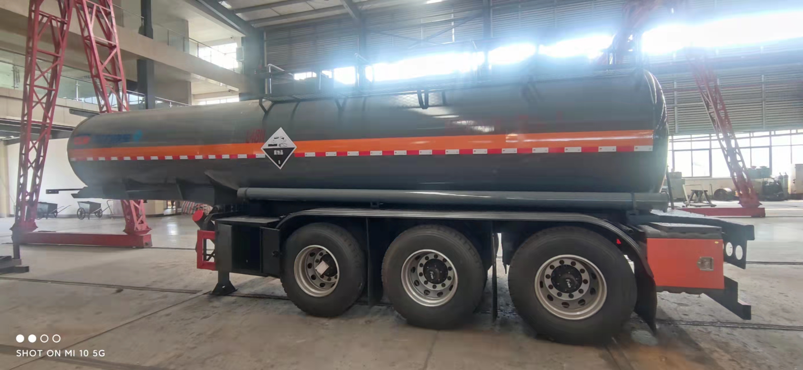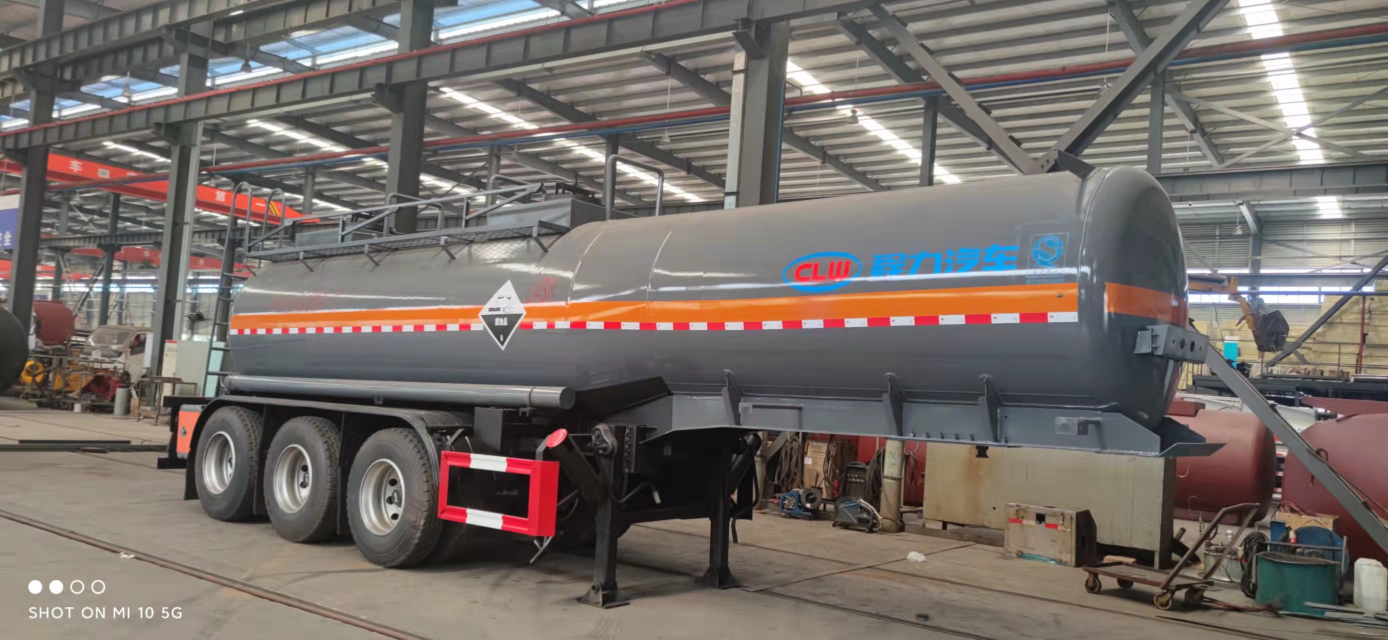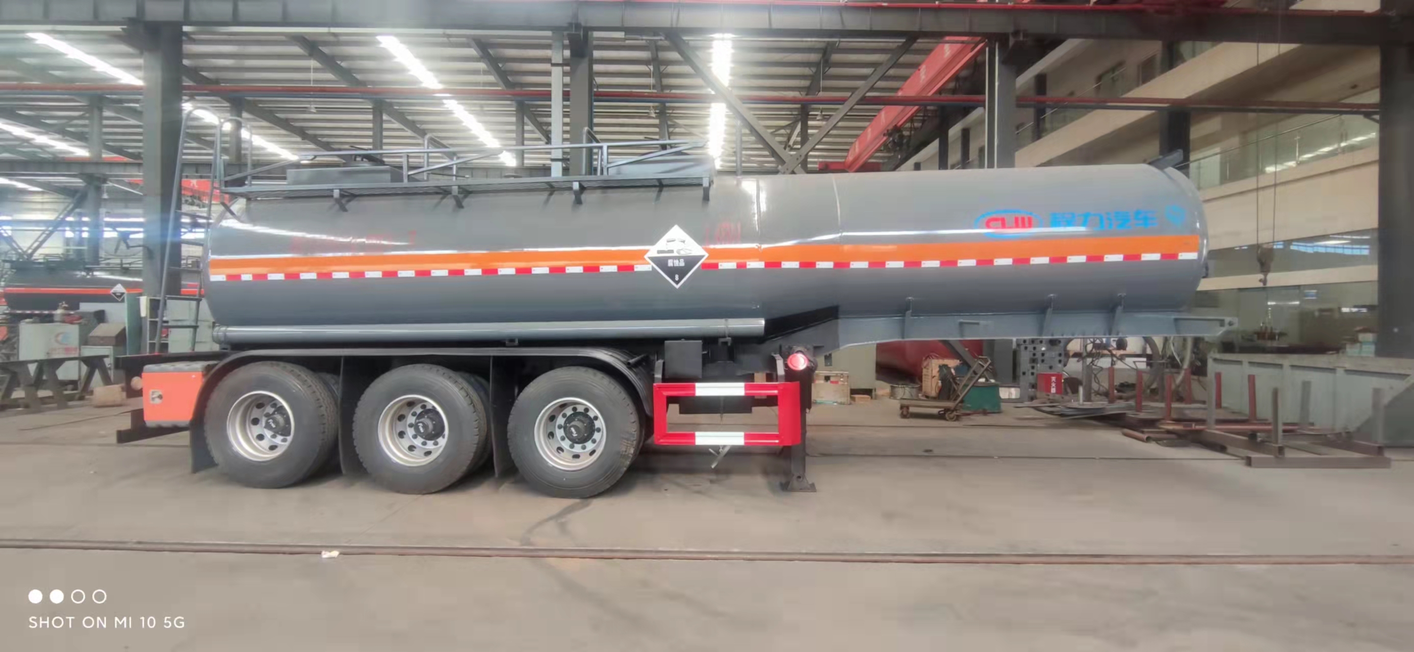 腐蝕性物品半掛運輸車整車型號:cl9401ggy,18.5方濃硫酸半掛,碳鋼板6 MM,封頭7.75mm,生產制作,兩個進料口,后尾部左右自流,10T富華車軸三軸,盤剎,空氣懸掛,EBs,備胎架,工具箱,1200真空胎12條。外罐體材質為Q235B型4.2mm厚板材,封頭4.5mm厚,罐體通倉,內襯16mm聚乙烯,雙層鋼襯塑防浪板,兩個全塑罐口蓋,兩套不銹鋼安全閥,帶全塑接酸盤并用軟管引下,罐口周圍用方盒子式圍邊,圍板內做重瀝青防腐,罐體頂部帶不銹鋼升降護欄,花紋板走道,罐體尾底部帶一個DN100不銹鋼襯氟海底閥(海底閥帶聲光報警裝置),罐體后尾部左右各一個DN80襯氟球閥為出料口帶全塑保護箱,大梁下出料,一個工具箱,尾部爬梯。兩根卸料管,兩個8KG滅火器,其余標配。