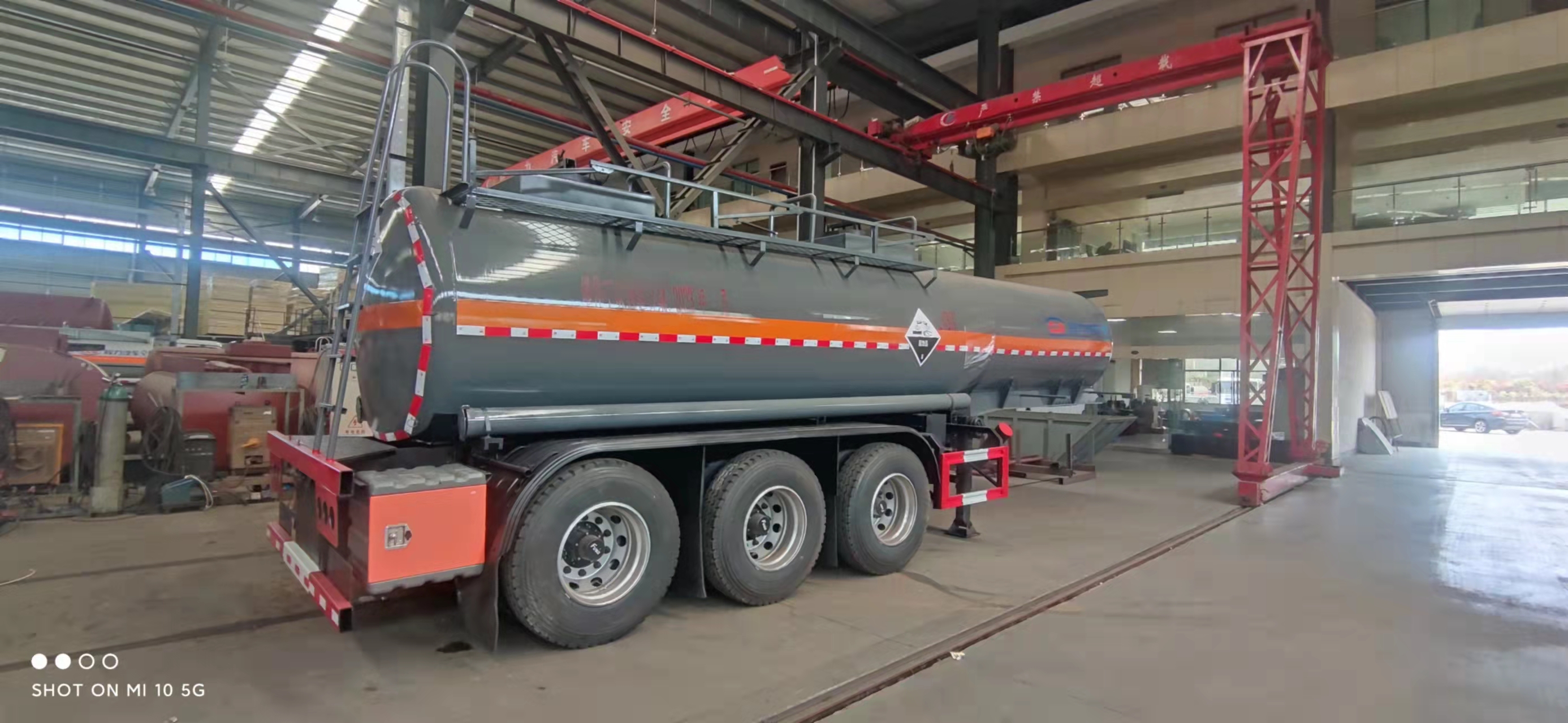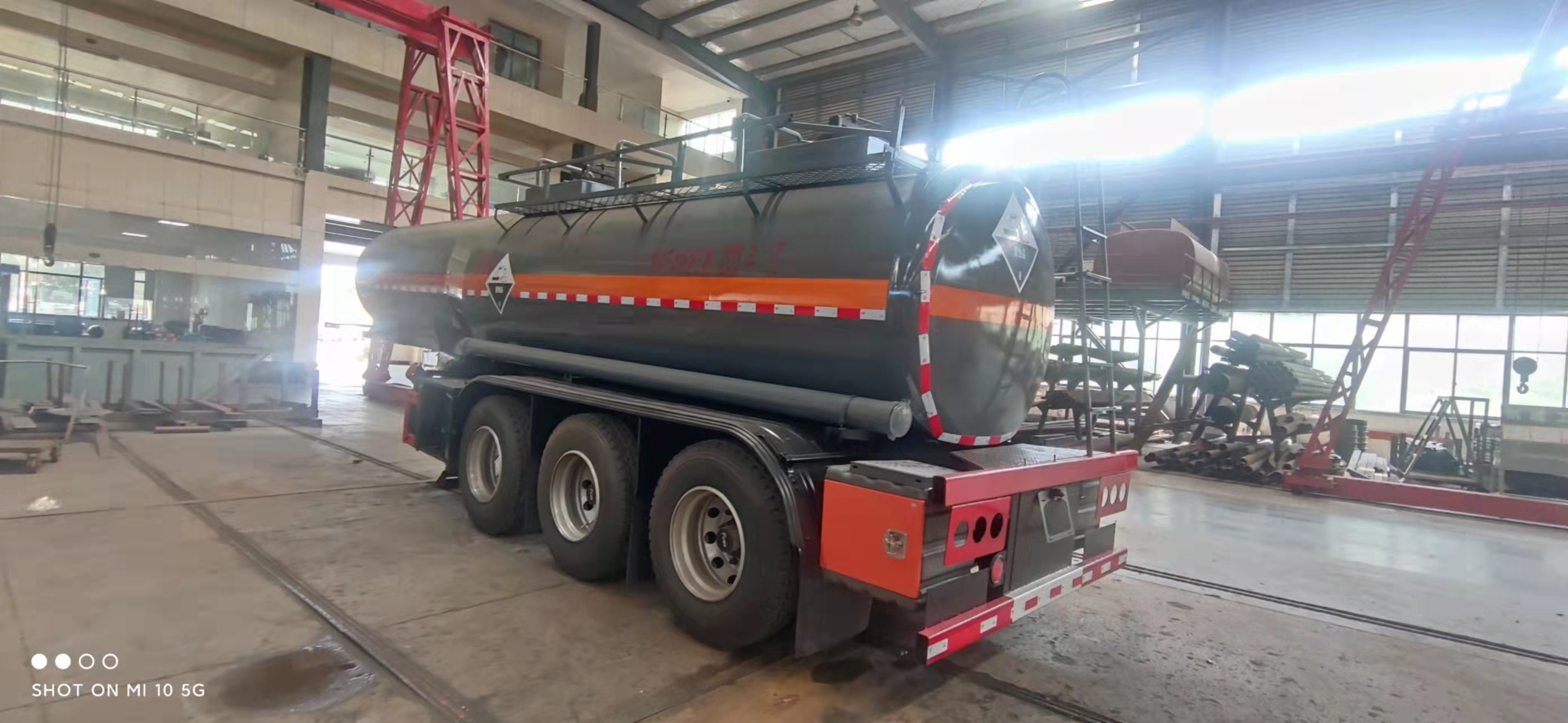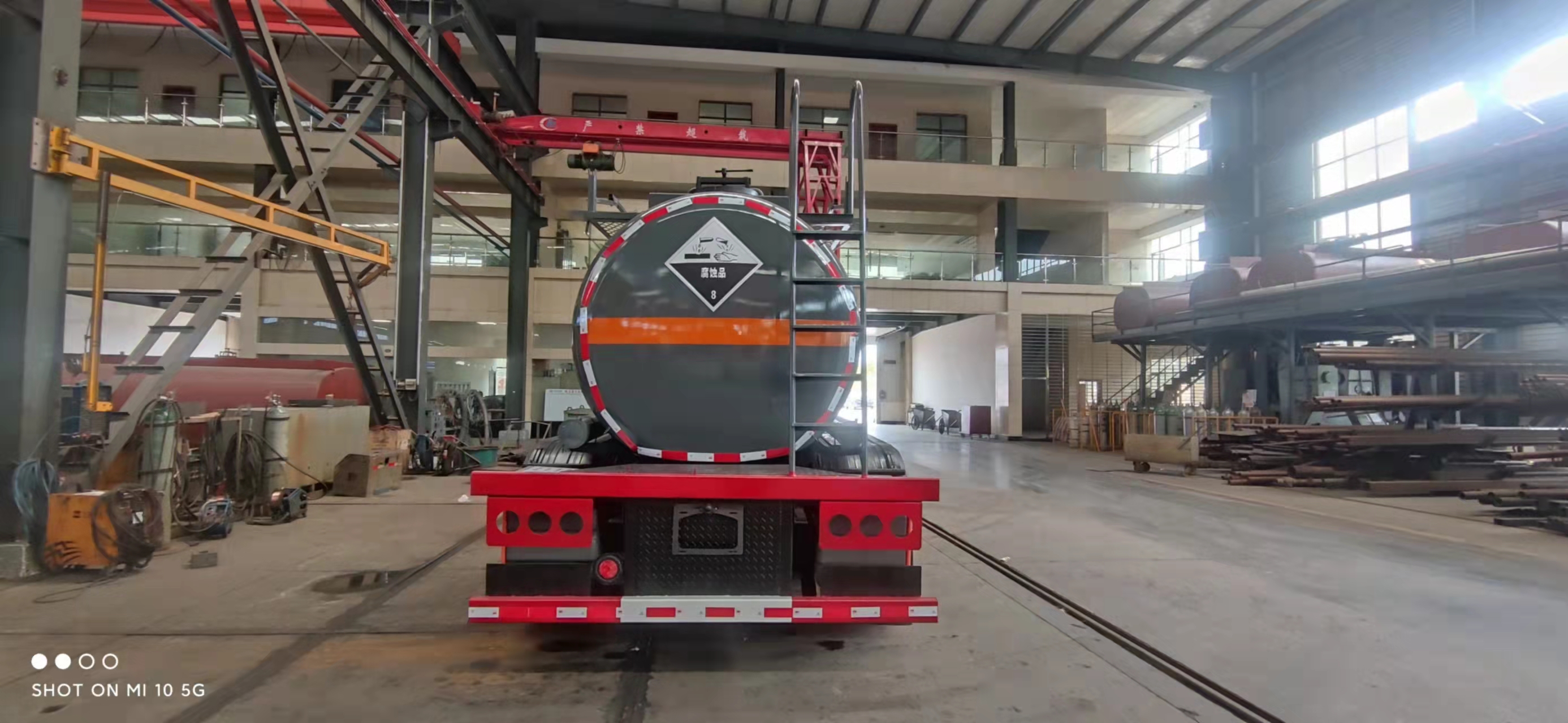 腐蝕性物品半掛運輸車整車型號:cl9401ggy,18.5方濃硫酸半掛,碳鋼板6 MM,封頭7.75mm,生產制作,兩個進料口,后尾部左右自流,10T富華車軸三軸,盤剎,空氣懸掛,EBs,備胎架,工具箱,1200真空胎12條。外罐體材質為Q235B型4.2mm厚板材,封頭4.5mm厚,罐體通倉,內襯16mm聚乙烯,雙層鋼襯塑防浪板,兩個全塑罐口蓋,兩套不銹鋼安全閥,帶全塑接酸盤并用軟管引下,罐口周圍用方盒子式圍邊,圍板內做重瀝青防腐,罐體頂部帶不銹鋼升降護欄,花紋板走道,罐體尾底部帶一個DN100不銹鋼襯氟海底閥(海底閥帶聲光報警裝置),罐體后尾部左右各一個DN80襯氟球閥為出料口帶全塑保護箱,大梁下出料,一個工具箱,尾部爬梯。兩根卸料管,兩個8KG滅火器,其余標配。