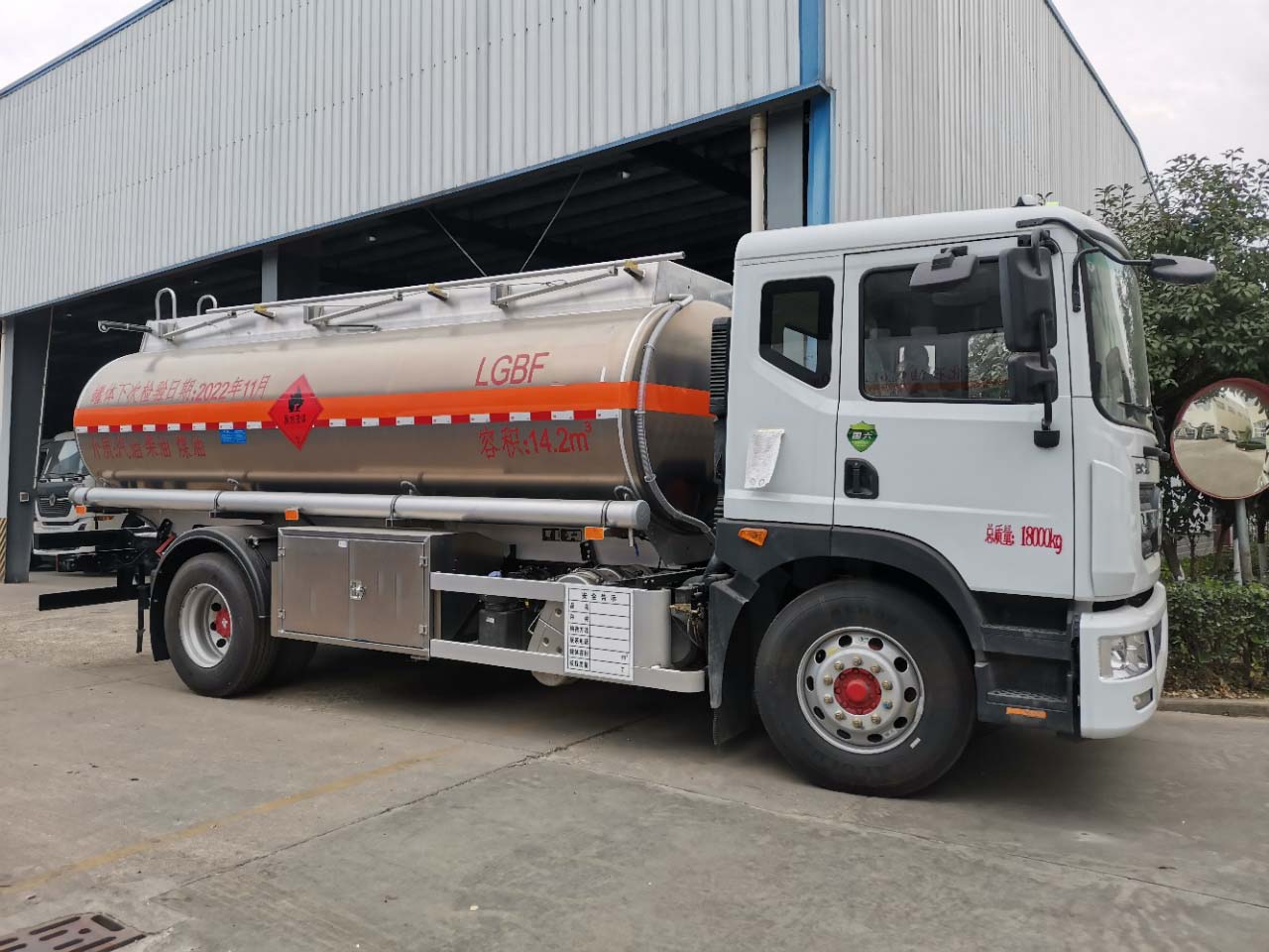 東風D9國六鋁合金罐式運輸車采用國六東風D9底盤,底盤型號:EQ1185L9CDFWXP,康明斯230馬力發動機,法斯特8檔,軸距4700mm、295真空胎,罐體公告容積14.2立方(介質:柴油,汽油,煤油),歐標全套,單倉、80-80專用油泵三寸管道,三寸出油口,預留加油機位置。