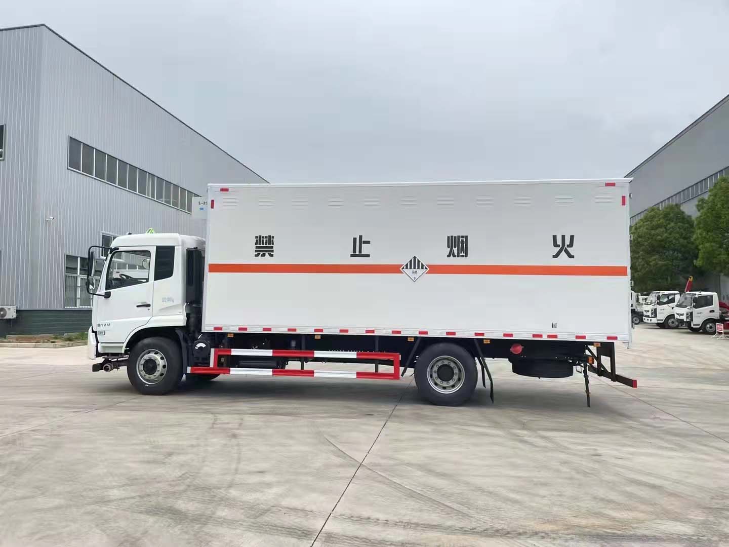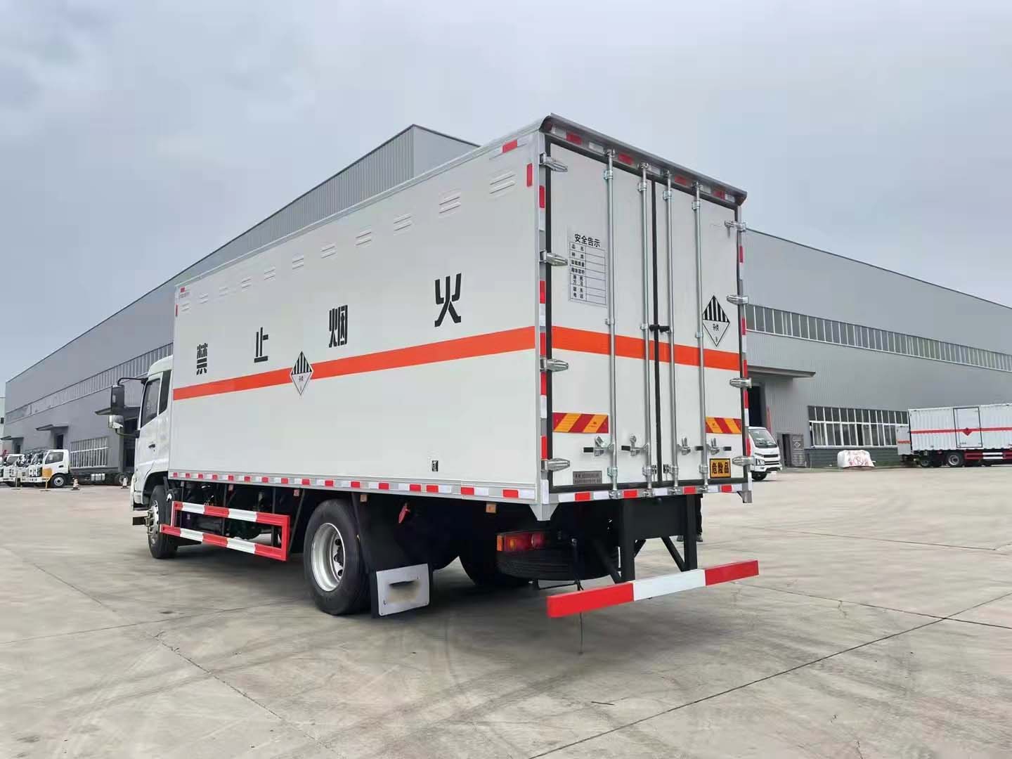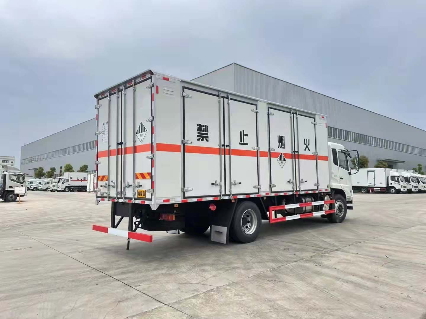 東風天錦雜項國六帶制冷機組危險品車嚴格按照公告尺寸制作。外板采用烤漆板帶百葉窗,內飾為導電性能良好的鋁平板有透氣孔,矩形骨架結構內部填充防火阻燃材料,復合加鉚合工藝。廂體四周鋁合金包邊及包角,車廂底板鋪設防靜電膠皮,廂體前臉50公分高鋪設防靜電膠皮。后部設置對開門,右側單開門,廂體內部兩側安裝捆綁貨物的臥環。廂體內部安裝煙霧,門上安裝防盜。車廂一周粘貼橙色反光帶,箱體粘貼菱形標志牌,安全告示牌,危險品牌,箱體安裝示廓燈(前白后紅),拖地靜電帶。
