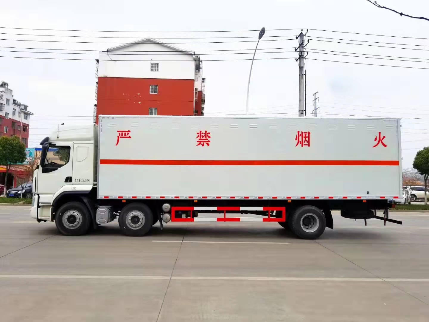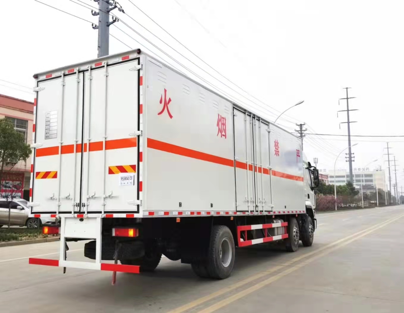 柳汽三軸9米6國六爆破器材運輸車整車尺寸:11900×2550×3960mm,廂體尺寸:9500×2400×2410mm。外板采用1mm厚冷軋板有一次性成型的百葉窗,內飾為導電性能良好的鋁板有透氣孔,內襯為矩形管骨架牢靠穩(wěn)定,內部填充為透氣防潮阻燃的擠塑板,廂體外部上下鋁合金型材包邊,底板和車廂前下部鋪橡膠皮,后門雙開,右側選裝雙開門,內部有固定貨物的臥環(huán),車輛外部有靜電帶、滅火器、防火罩,車廂內安裝煙霧報警器和門防盜報警器,嚴格按照國家危險品相關法規(guī)張貼危險品標識和反光標志等。