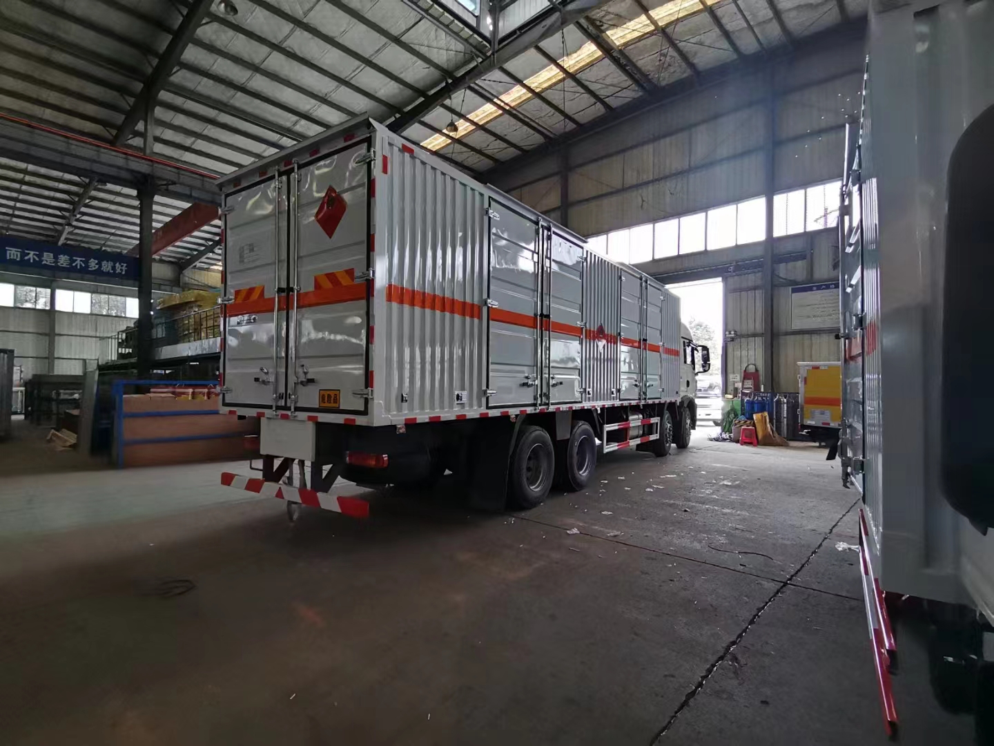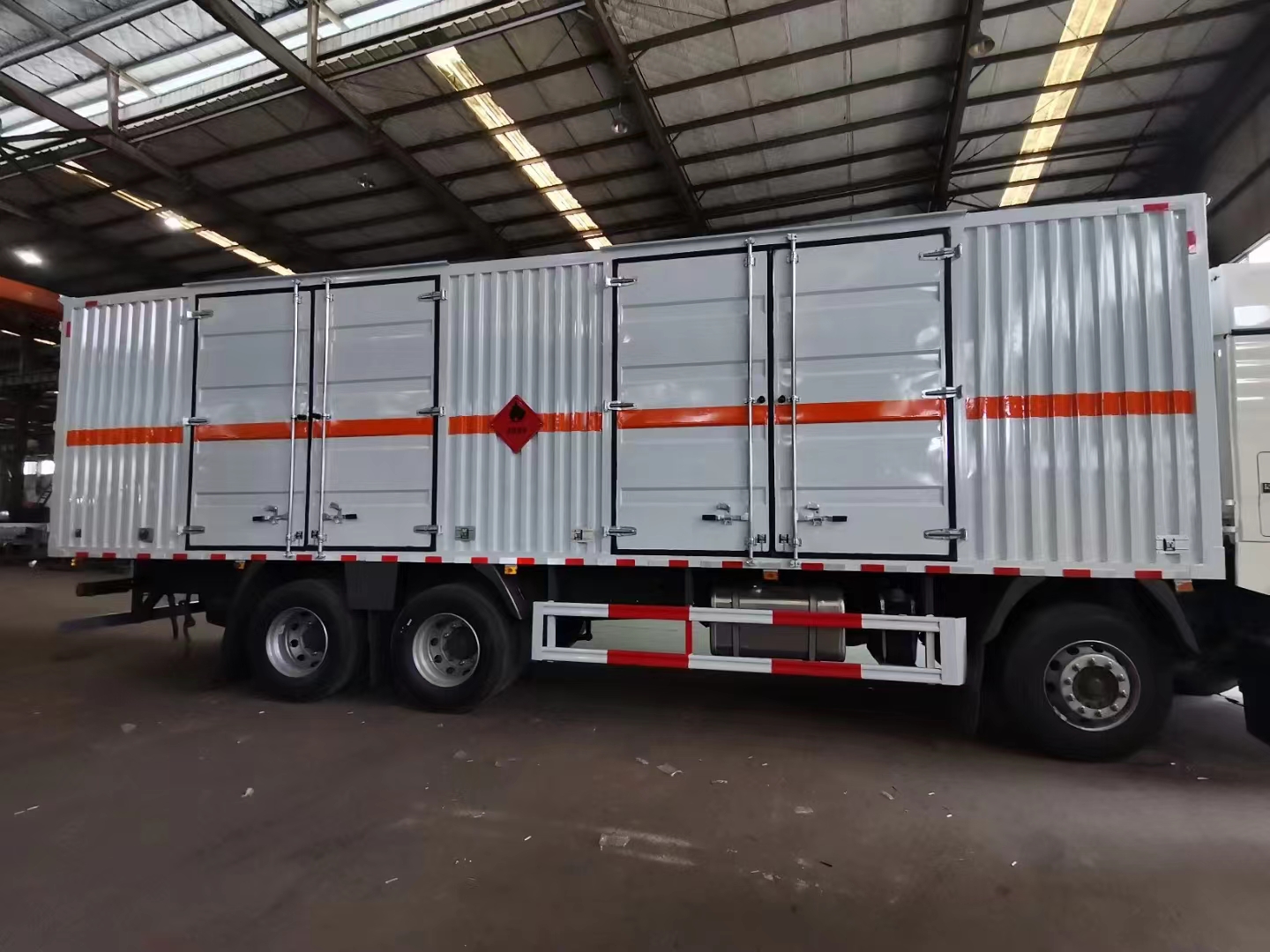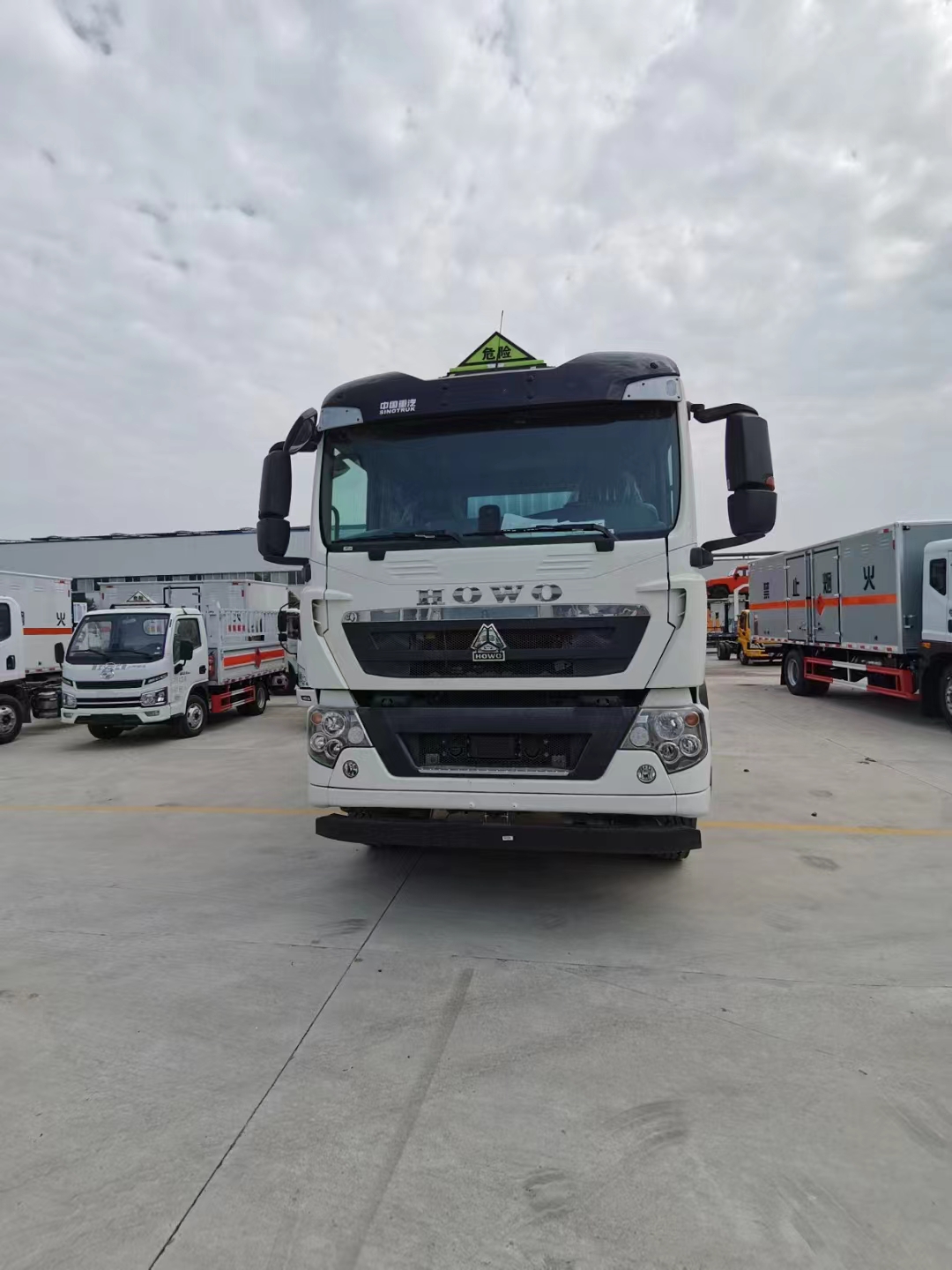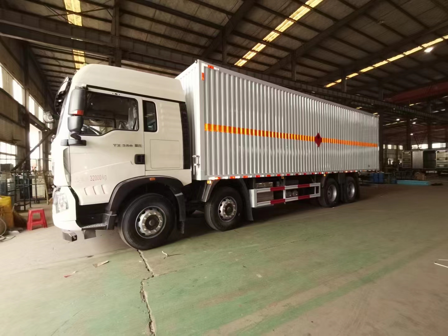 汕德卡國六前四后八瓦楞板危險品車采用的是汕德卡 G5高頂雙臥駕駛室;MC07H.35-60發動機;HW13709XSTC2變速箱;VPD75D前軸(盤);MCY11BGS自調臂雙后橋(鼓);速比4.63;雙層車架(8+4/280);前少后空氣懸架(3/3/-/-);博世方向機;前置排氣系統;AEBS(EBS+ESC);高位保險杠(全金屬),295/80R22.5;400L油箱;LDWS+FCWS;中國重汽智能通B版;電磁式電源開關;轉向輪爆胎應急裝置;