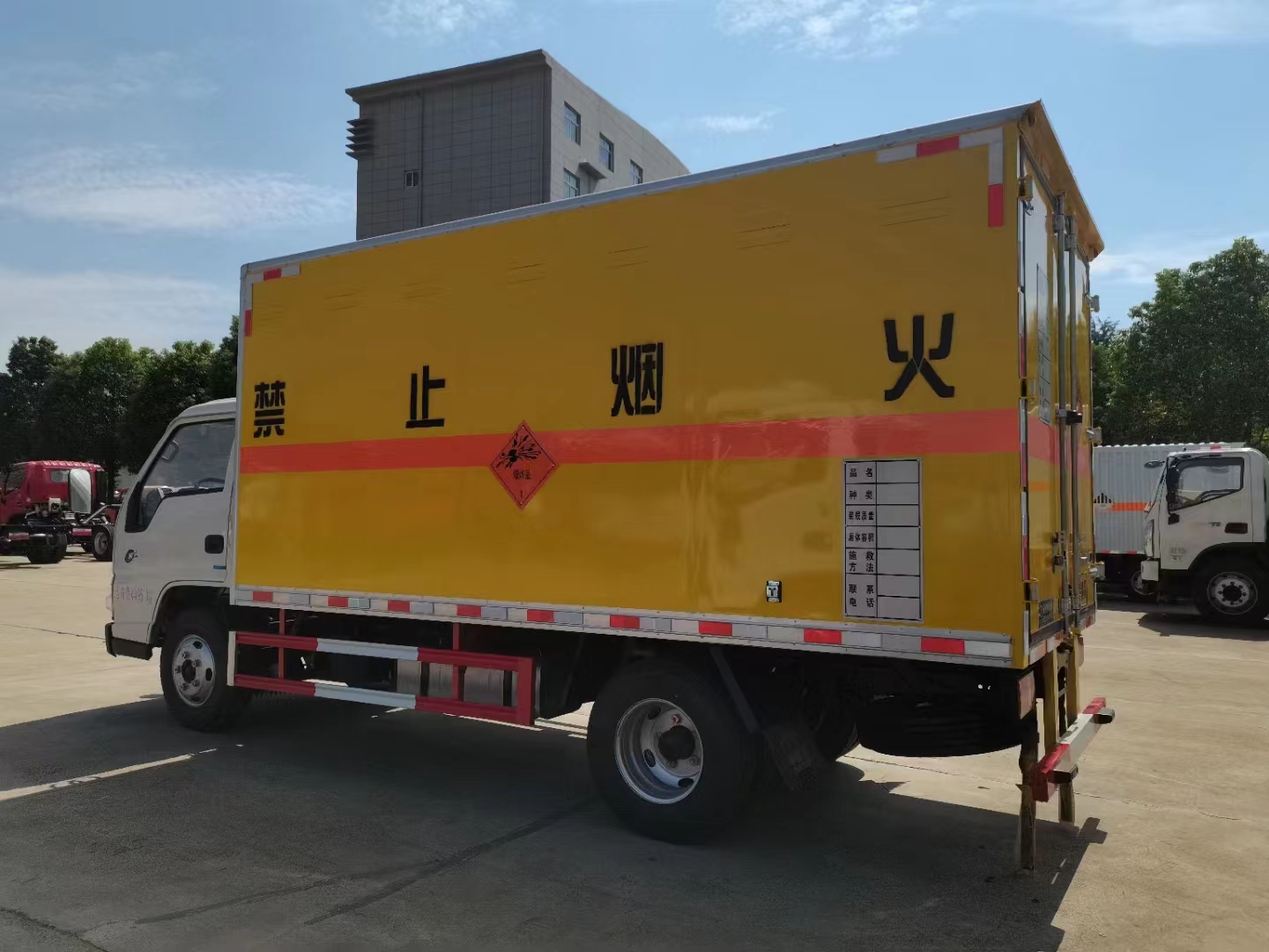 拉雷罐、炸薬、煙椛等物品都屬于一類危化品車,該類車型需要專用的車型,為了運輸方便,都選擇藍牌的車型,程力專汽為您推薦的是江鈴國六帶前開側門黃色危險品車,以下是詳細配置介紹: