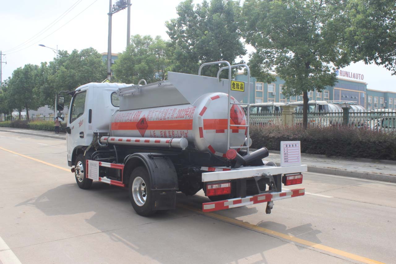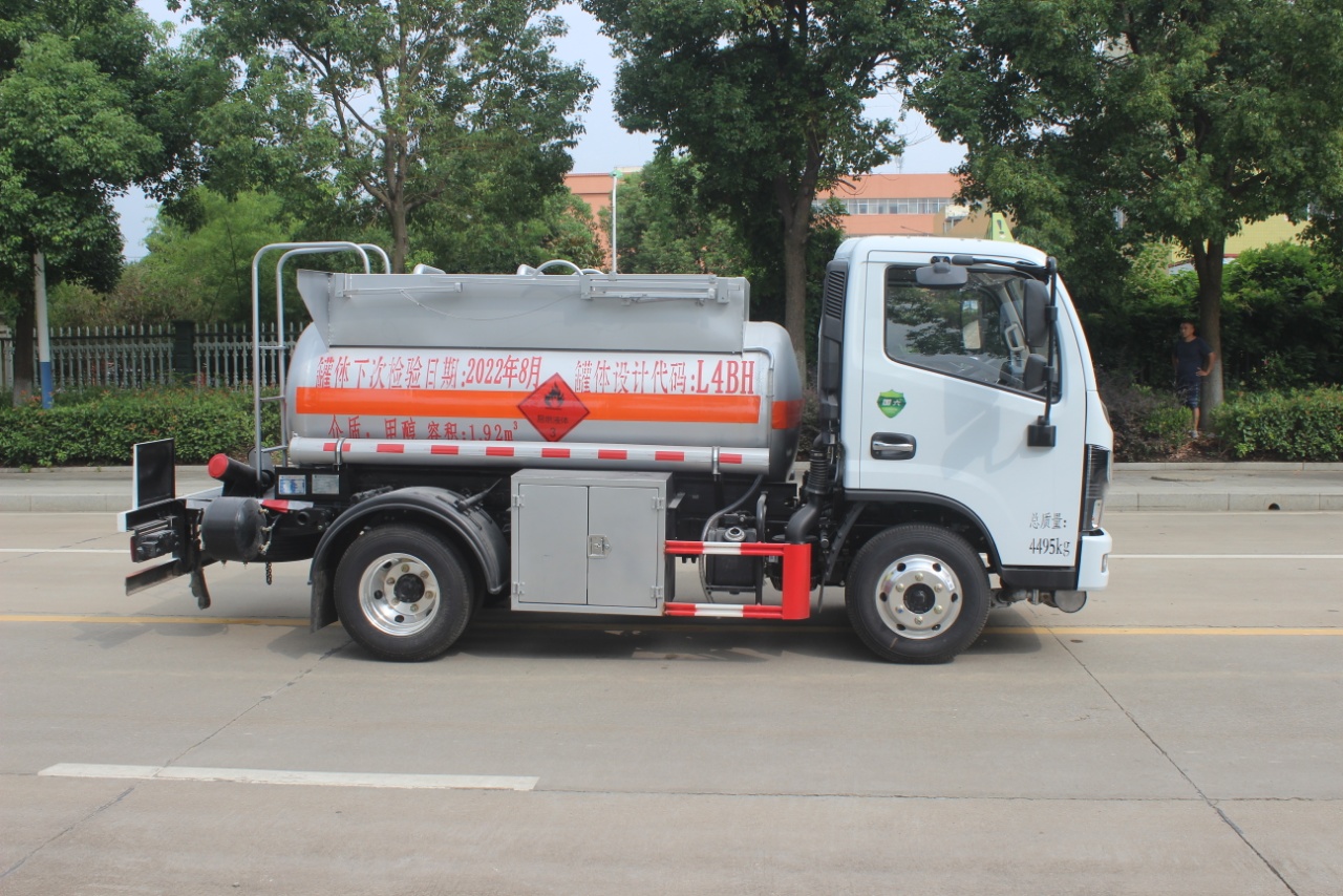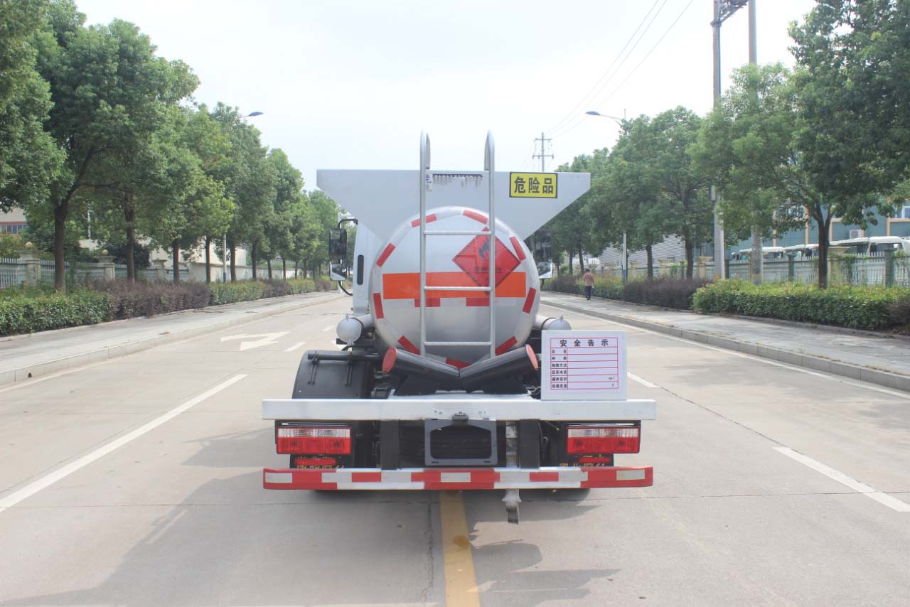 因涉及到上藍牌,罐體總容量:2.11立方。罐體材料采用Q235B型4.2mm(≥4.05mm),封頭4.2mm(≥4.05mm),罐體通倉,帶山東銅芯泵,泵進出口在副駕大梁尾部一側,一套普通罐口,帶一套安全閥,爆破片。一套DN80型緊急切斷閥(帶聲光報警裝置),正駕大梁一側雙開門工具箱,不銹鋼固定護欄,尾部爬梯。配一個防火帽,靜電帶,兩根卸料管,兩個滅火器,帶一個工具箱。其余廠內標配。
