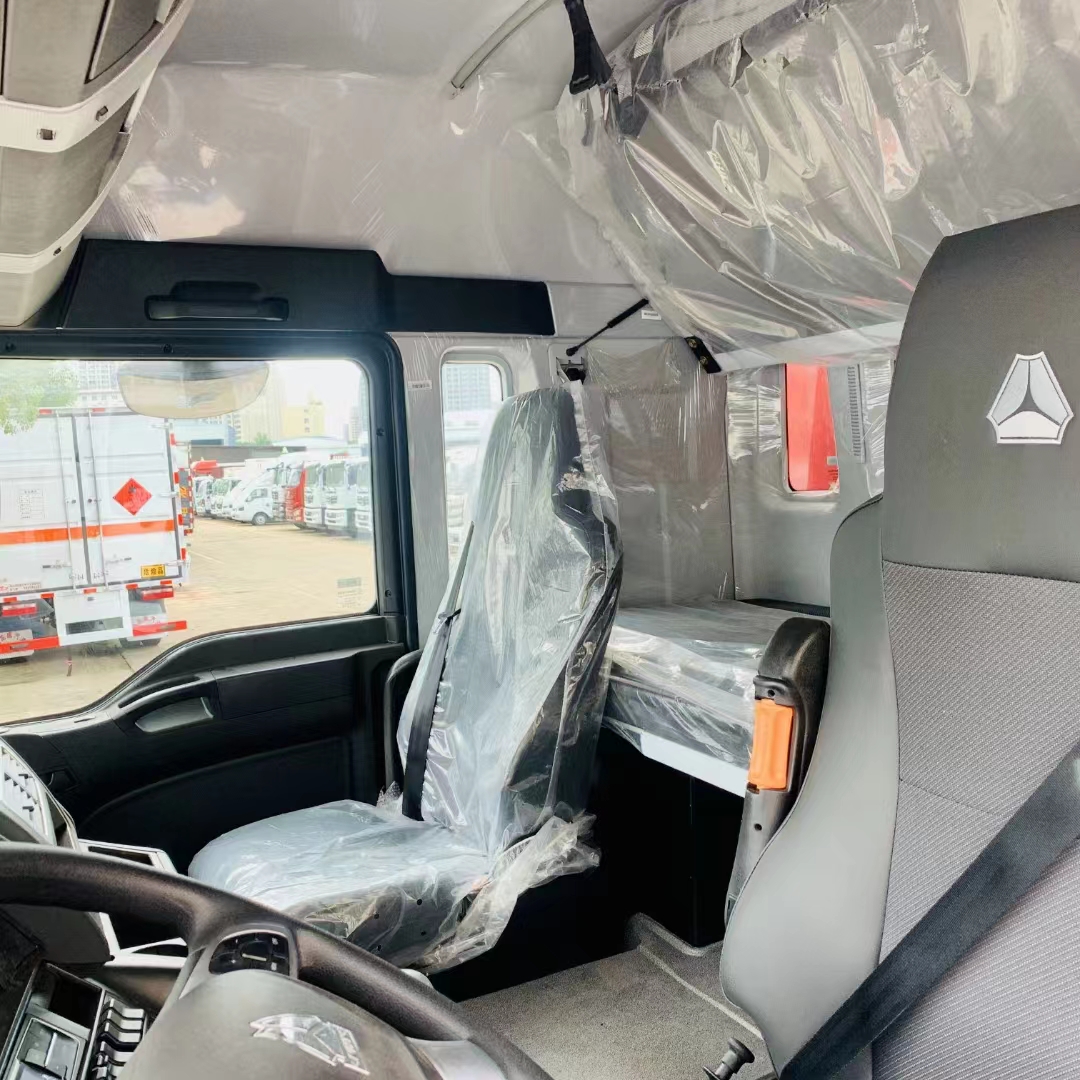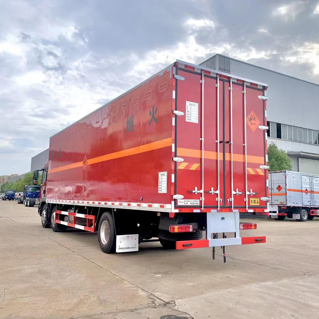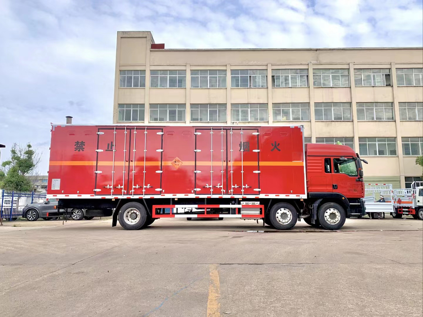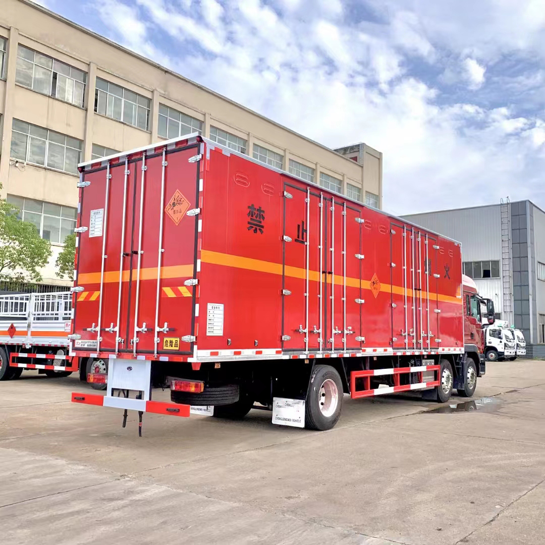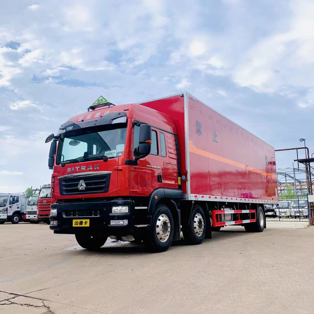 汕德卡國六三軸紅色帶雙開側門危險品車采用的是專用危貨底盤,汕德卡 G5暢行駕駛室;選用的是高頂雙臥;帶多功能方向盤、電動電加熱后視鏡、可選MC07.25-60發動機或310馬力發動機;HW95508STCL變速箱;VPD050QB前軸(盤);MCY11BGS自調臂單后橋(鼓);速比4.63;雙層車架(8+4/280);前少后空氣懸架(3/3/-);博世方向機;限速79km/h;前置排氣系統;AEBS(EBS+ESC);高位保險杠;295/80R22.5輪胎;400L油箱;LDWS+FCWS;中國重汽智能通B版;電磁式電源開關;終端排放監控裝置;轉向輪爆胎應急裝置;165AH蓄電池。
