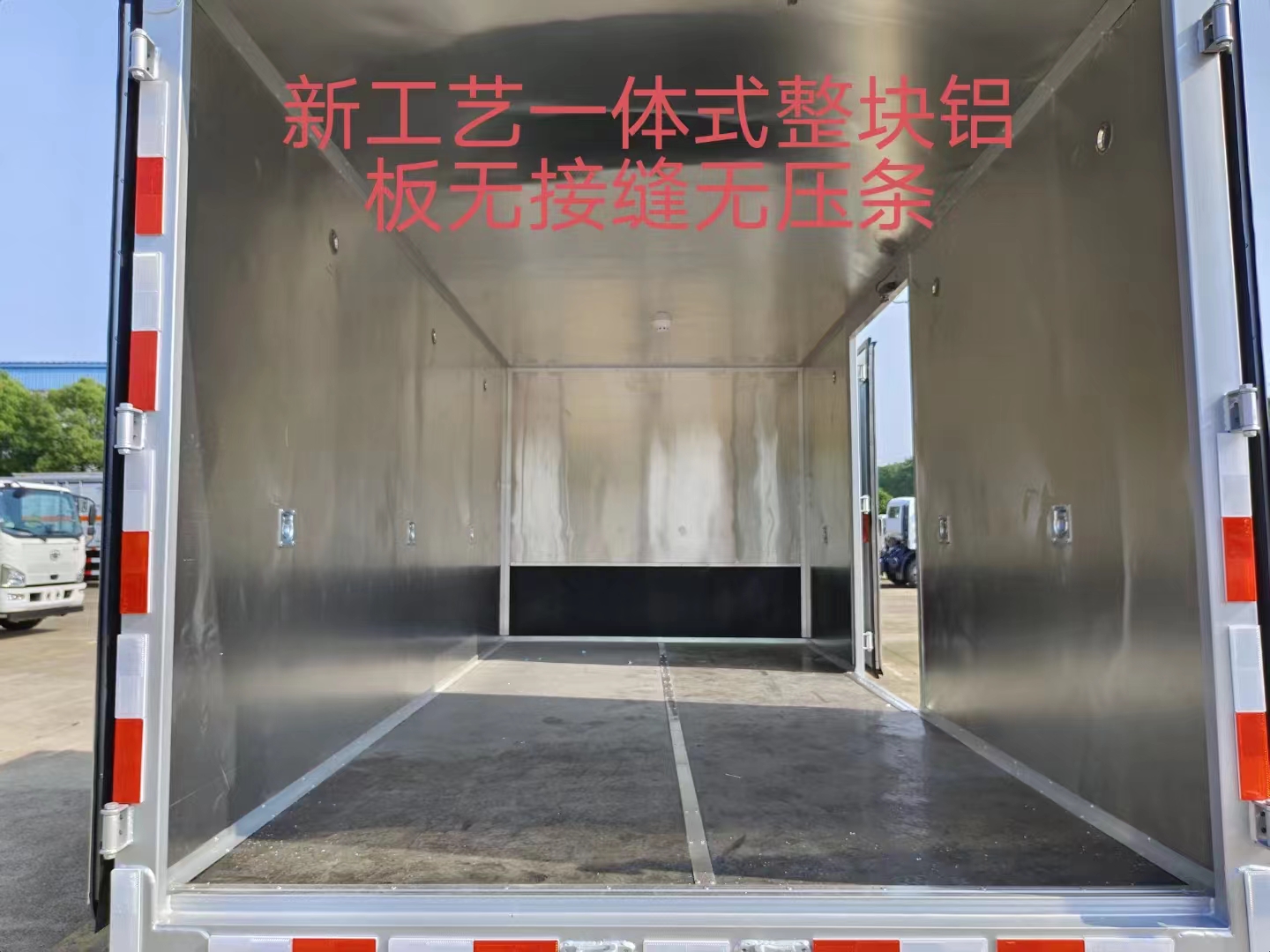 1、根據客戶反映,廂體內部壓條,車子長時間行駛顛簸路面,容易引起鉚釘松動,導致壓條脫落,拼接處變形,容易導致包裝物表面受損,特別是煙花爆竹類的包裝物。根據客戶反映實際情況,我公司特作出改進,廂體內部采用一體式整塊鋁板,相對于之前的拼接來說,廂體內部更加美觀整潔,不易變形,不會剮蹭貨物。