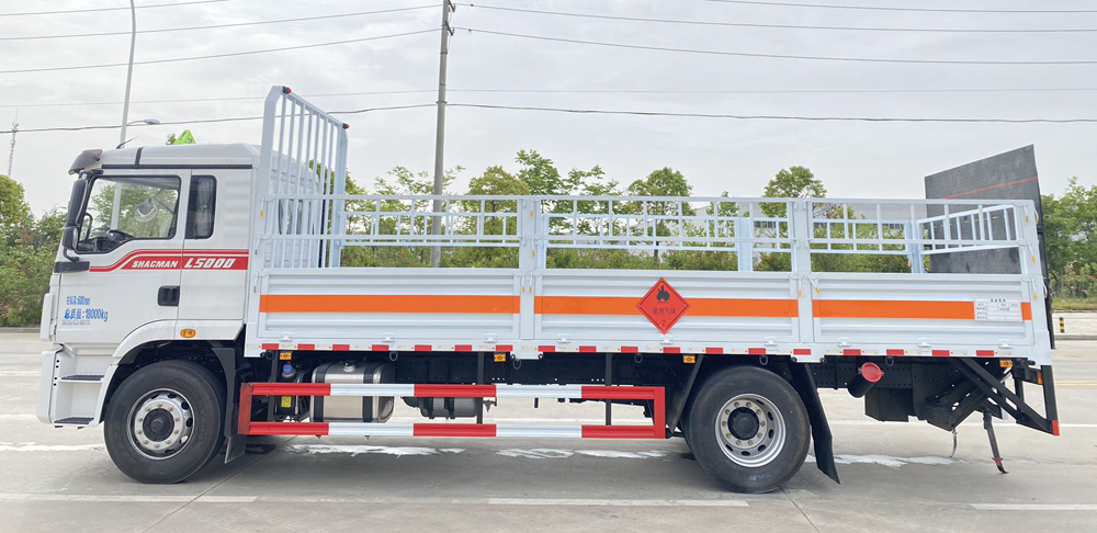 陜汽德龍單橋國六6米8氣瓶運輸車廂體邊板采用1.2mm冷板,底板花紋鋼板,花欄及花欄立柱可拆卸,底部立柱固定,底板上方鋪靜電膠皮,底板均做防銹處理,車廂一周粘貼橙色反光帶,箱體粘貼菱形標志牌,安全告示牌,危險品牌,拖地靜電帶。裝載噸位可達10噸,尾部可加裝液壓尾板,整車不超重。