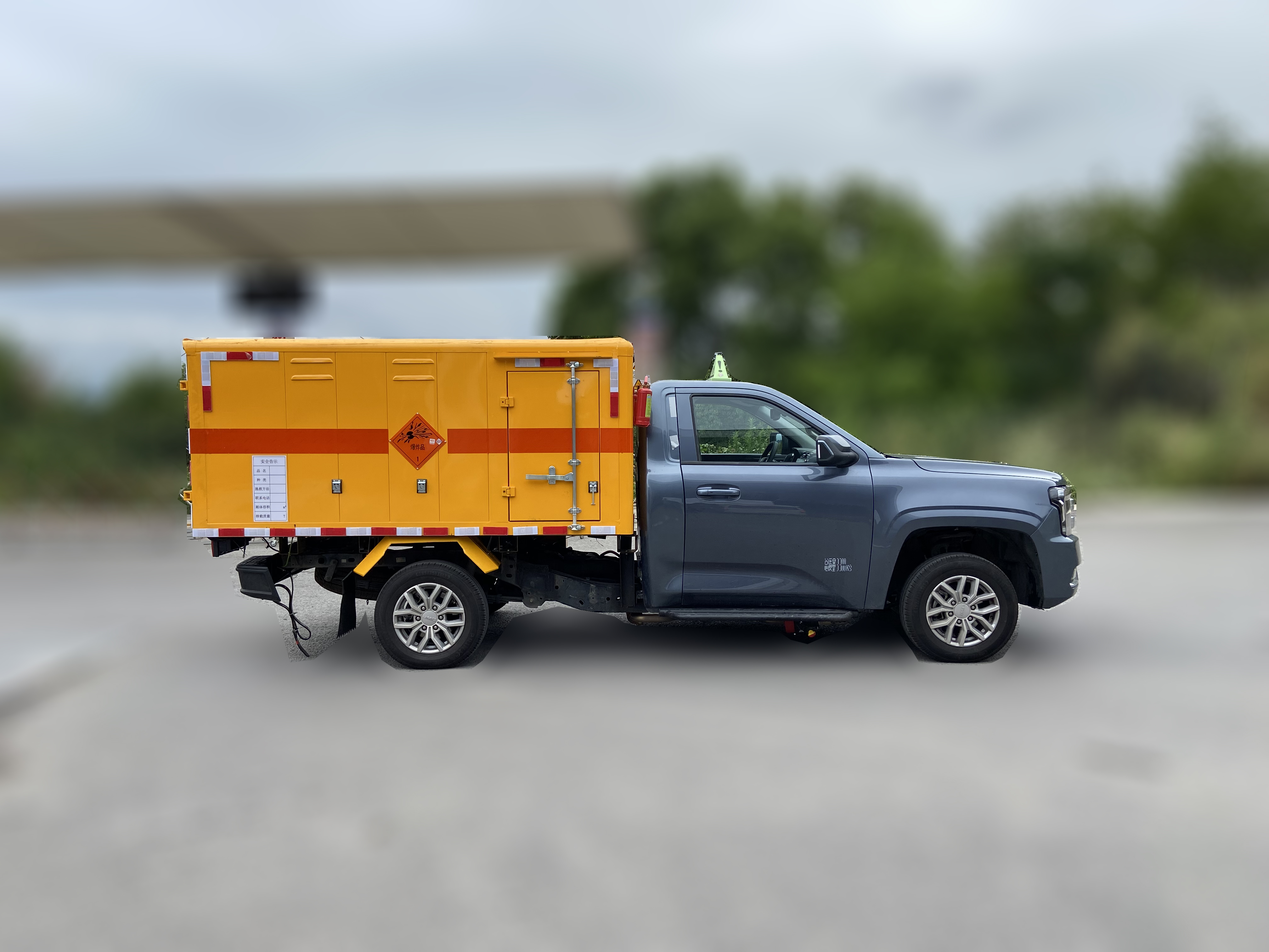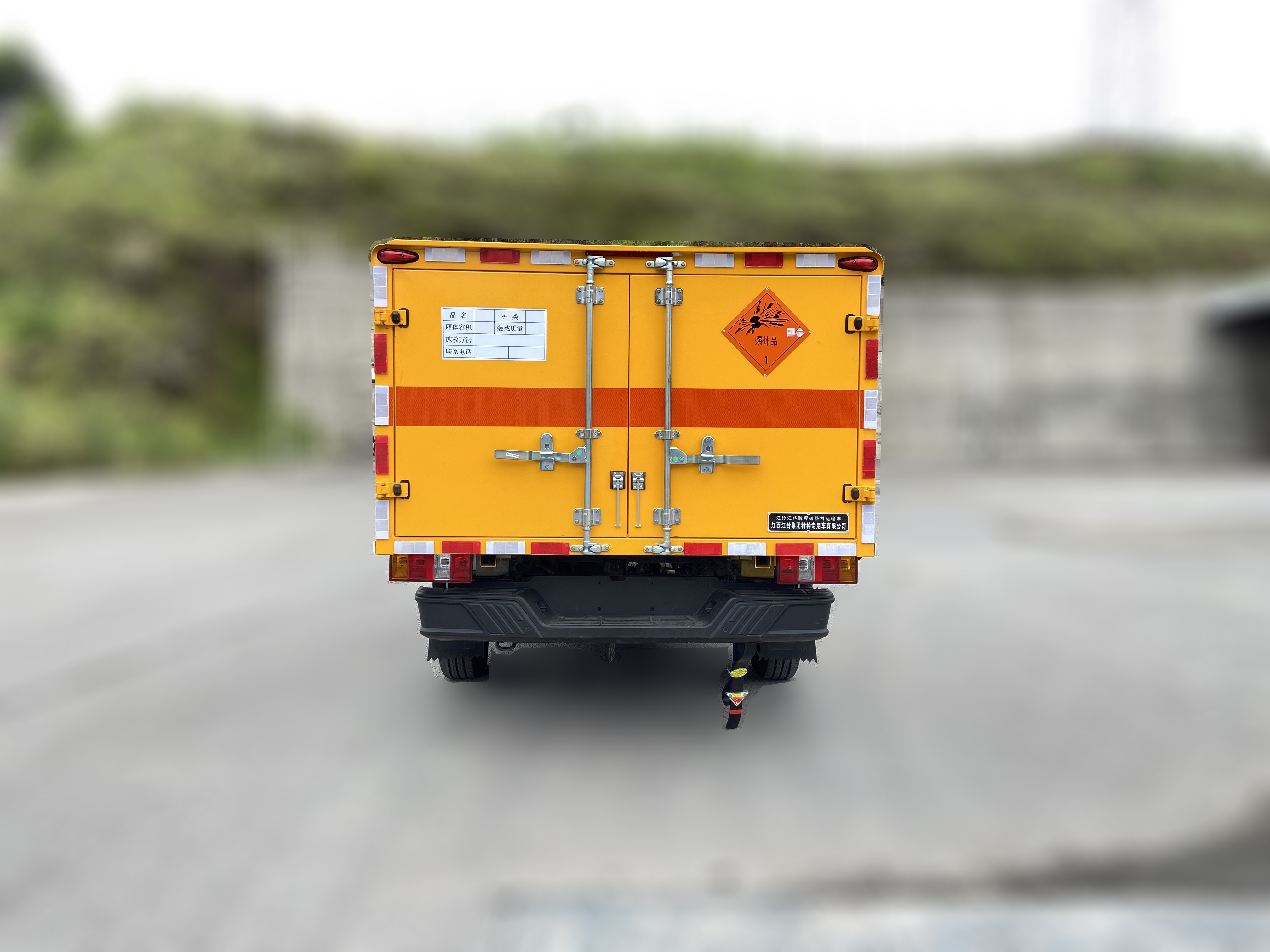 江鈴大道原廠全新規國六四驅皮卡爆破器材運輸車整車型號JMT5034XQYXYF6,3270mm軸距,上戶815kg,新規(車道偏離預警,防碰撞預警),采用江鈴皮卡JX1037TFA6單排駕駛室,江鈴177馬力發動機(JX4D23A6L)采用福特技術,外形尺寸5540*1935*2050mm ,貨箱尺寸2560*1870*1055mm,箱體為雙層金屬骨架結構,外冷軋鋼板內飾鋁板,內壁采用鋁合金板蒙面,夾層為隔熱阻燃材料填充,廂體內部做通風窗口,中開側門,廂體內部做防靜電處理,廂體底部鋪導靜電膠板,車輛副梁配備導靜電帶,廂體內襯壁裝單排臥環,廂體內頂部安裝煙感報警器,廂體安裝防盜報警器。隨車配備手提滅火器,危險品三角頂燈,防護帽等,嚴格按照國家危險品法規進行“爆”標識粘貼等。隨車提供資料:機動車購車發票,整車合格證,隨車工具,服務手冊,保修手冊。