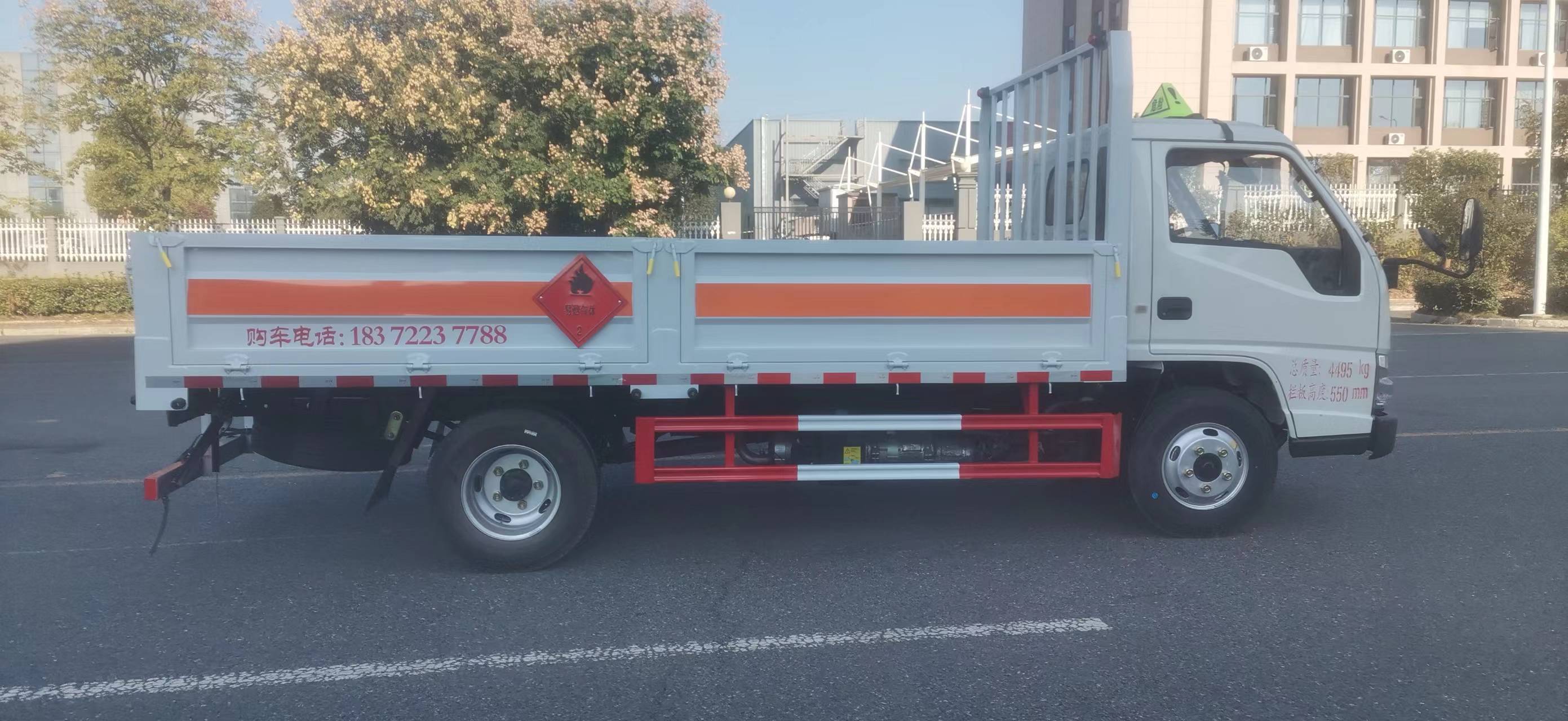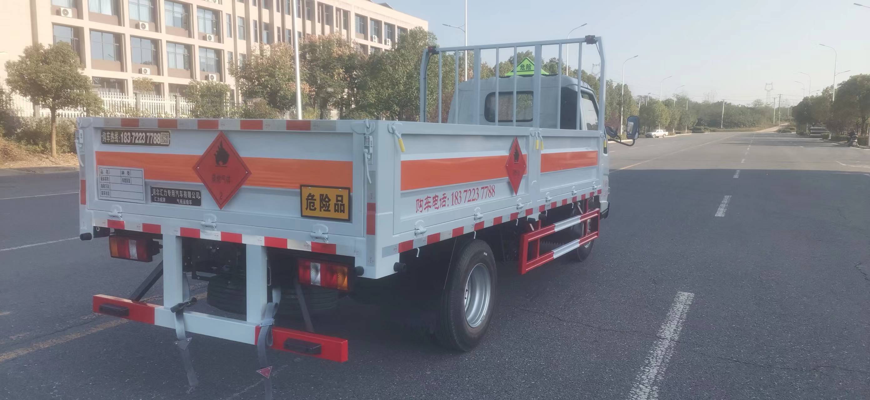 江鈴國六1.8噸藍牌氣瓶車選用的是危化品專用底盤,五十鈴122馬力發動機,帶中控鎖、電動門窗、原廠空調,廂體邊板采用1.2mm冷板,底板花紋鋼板,花欄及花欄立柱可拆卸,底部立柱固定,底板上方鋪靜電膠皮,底板均做防銹處理,車廂一周粘貼橙色反光帶,箱體粘貼菱形標志牌,安全告示牌,危險品牌,拖地靜電帶。裝載噸位可達1.8噸,尾部可加裝液壓尾板,整車不超重。