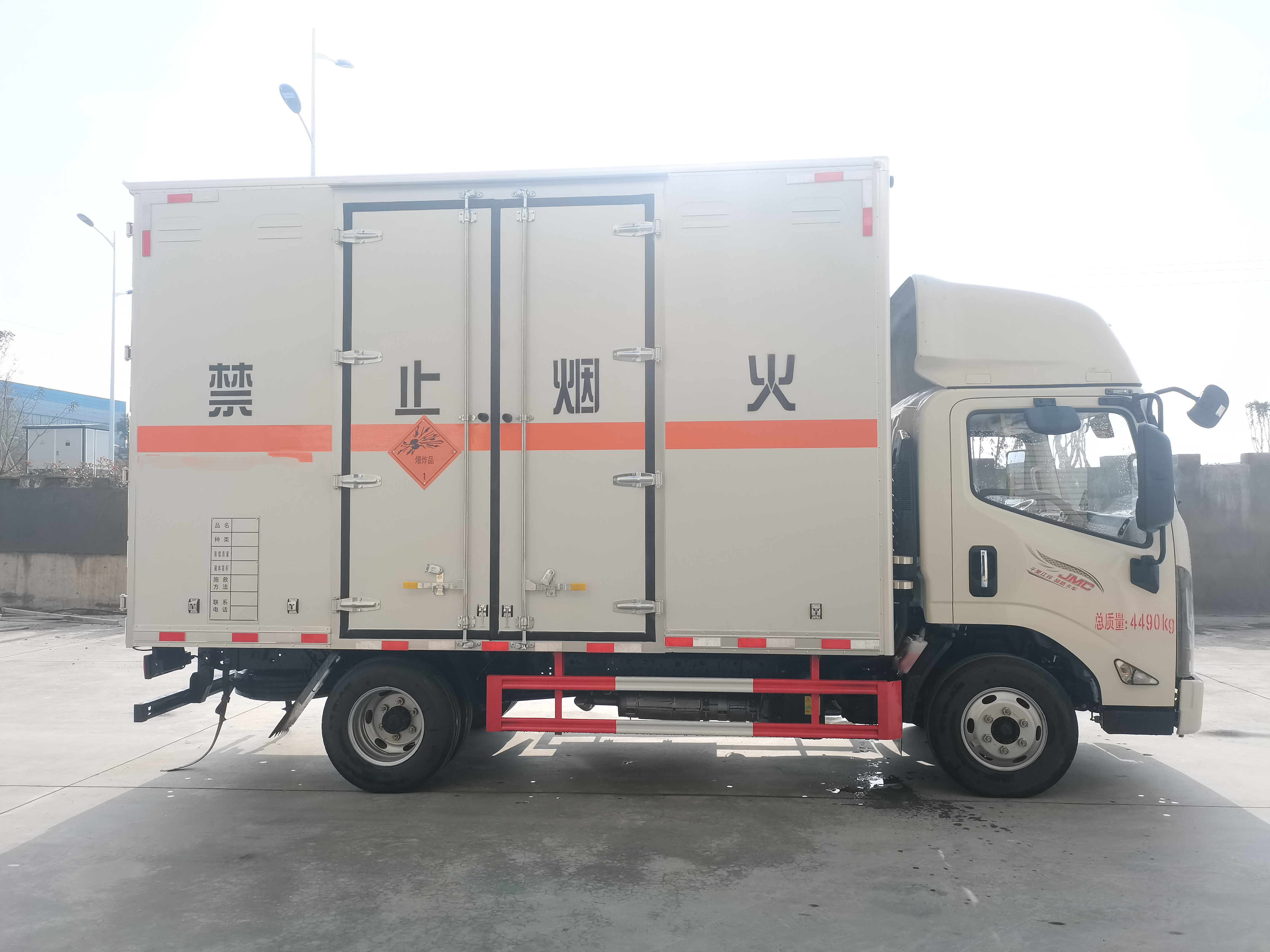 江鈴凱運寬體2米5高爆破器材運輸車貨箱尺寸:長:4200,4150 寬:2100,2050,2000 高:2600,2500,2400,2300,2200,2100,2000,1800,1700mm,總質量(kg):4490,額定載質量(kg):950,995,1050,1150整備質量(kg):3345,3300,3245,3145,廂體為雙層金屬結構,外板采用靜電屏蔽烤漆板,中間填充B1級阻燃泡沫,內飾為鋁板。廂體上側安裝防雨通風透氣孔。底板為花紋板,上鋪防靜電膠皮,廂體右側中開單側門。廂內兩側加裝固定貨物臥環,門框帶防盜報警器,頂部帶煙霧報警器。配備隨車工具,滅火器,三角頂燈,防靜電拖帶,貼反光標識等。其他按公告標準制作。