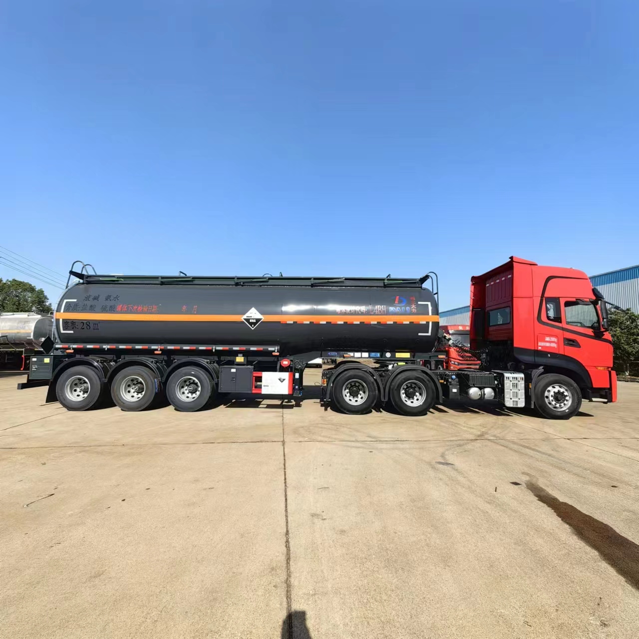 28方鹽酸腐蝕品半掛運(yùn)輸車(chē)采用的是Q235碳鋼材質(zhì)制作,筒體采用的是標(biāo)準(zhǔn)設(shè)計(jì)厚度,罐體內(nèi)部采用的是聚乙烯襯塑,圍板內(nèi)部防腐處理,罐體采用的是全塑料進(jìn)料口。罐體內(nèi)采用的是防腐設(shè)計(jì),罐體頂部帶DN100氣動(dòng)不銹鋼襯塑海底閥。定制的是專(zhuān)用鋼襯塑球閥。尾部帶專(zhuān)用卸料口。為了讓用戶(hù)使用安心,加裝有活動(dòng)式水箱,防止罐體內(nèi)氣體卸料,采用進(jìn)水口可稀釋內(nèi)部空氣,使用更安全。