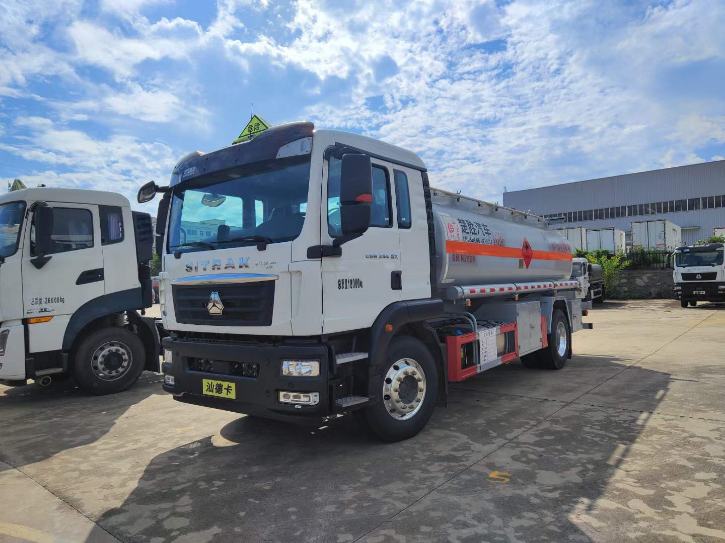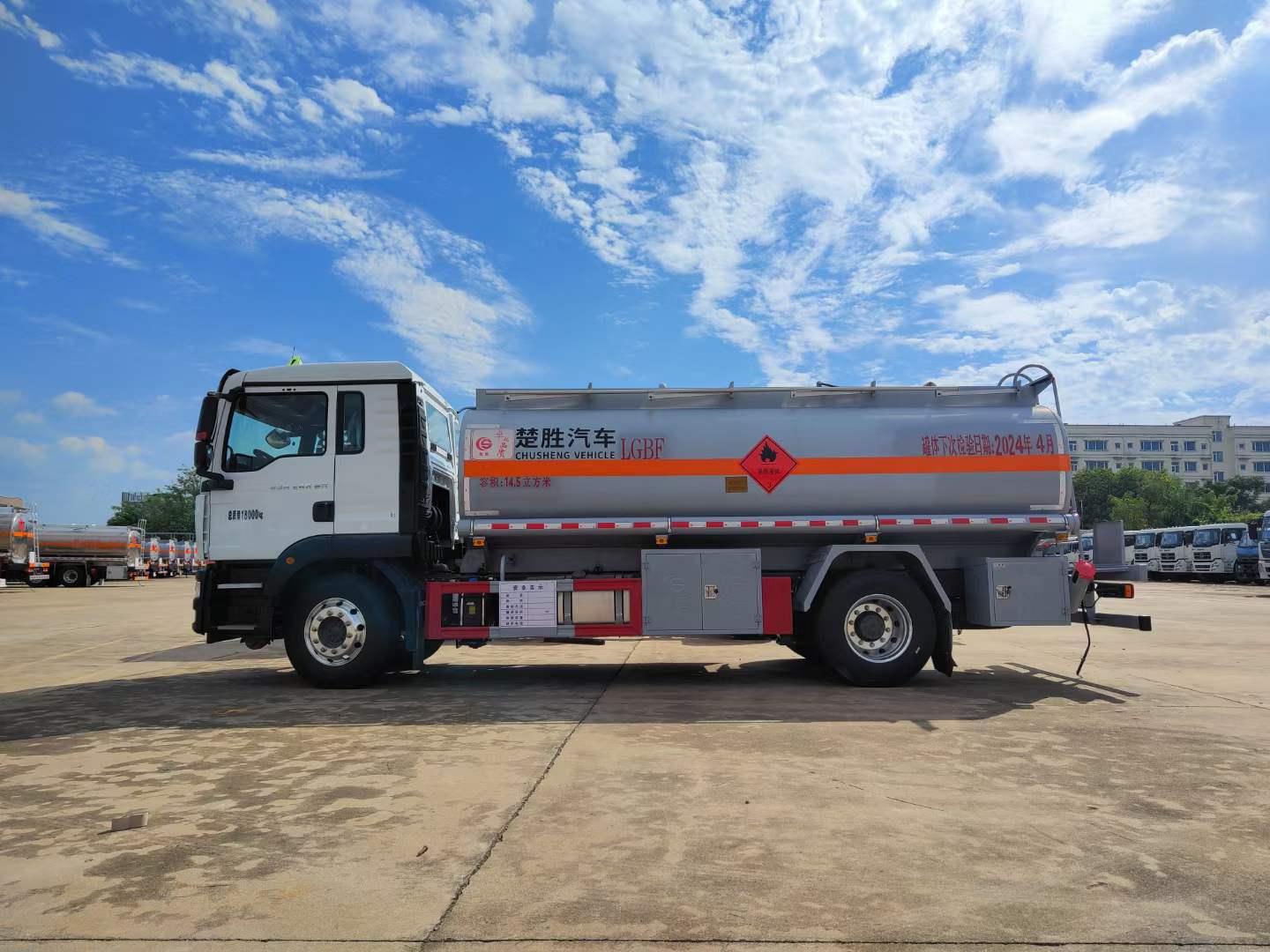 重汽汕德卡單橋油罐車可以出汽、柴油,大、小方量。環(huán)保、燃油齊全。選用的是危險品專用底盤,底盤型號:ZZ5186XXYK501GF1,汕德卡危化;G5-K駕駛室,軸距4700,自動空調(diào),電動電加熱后視鏡,主氣囊+副簡易型座椅,采用的是定制型濰柴245馬力發(fā)動機,WP7H245E62發(fā)動機,重汽8檔HW95508STC變速箱+HW45ZC法蘭式取力器,VPD050QB前軸(盤),MCJ09BGY自調(diào)臂單后橋(鼓),速比4.63,雙層車架(7+4/250),前少后空氣懸架(3/-),國產(chǎn)方向機,前置排氣系統(tǒng),EBS+ESC,高位保險杠(全金屬),鋁合金車輪(國產(chǎn)),295/80R22.5輪胎(縱向花紋/18PR),300L油箱,LDWS+FCWS(帶雷達),中國重汽智能通B版,電磁式電源開關(guān),轉(zhuǎn)向輪爆胎應急裝置,選裝胎壓監(jiān)測系統(tǒng),選裝危險品標志燈。重汽汕德卡單橋油罐車采用的是我司專用槽鋼罐體,帶防浪板,在油罐車裝卸過程中,實現(xiàn)全封閉氣體回收,限制油氣向大氣排放。油罐車通過缷油管路缷油的同時,加油站油罐中的油氣通過回氣管路回到油罐車中。油罐車將油氣帶回油庫進行處理,達到油氣回收的目的。匹配有海底閥、呼吸閥、安全閥等裝置,更好的貼合車輛使用需求。
