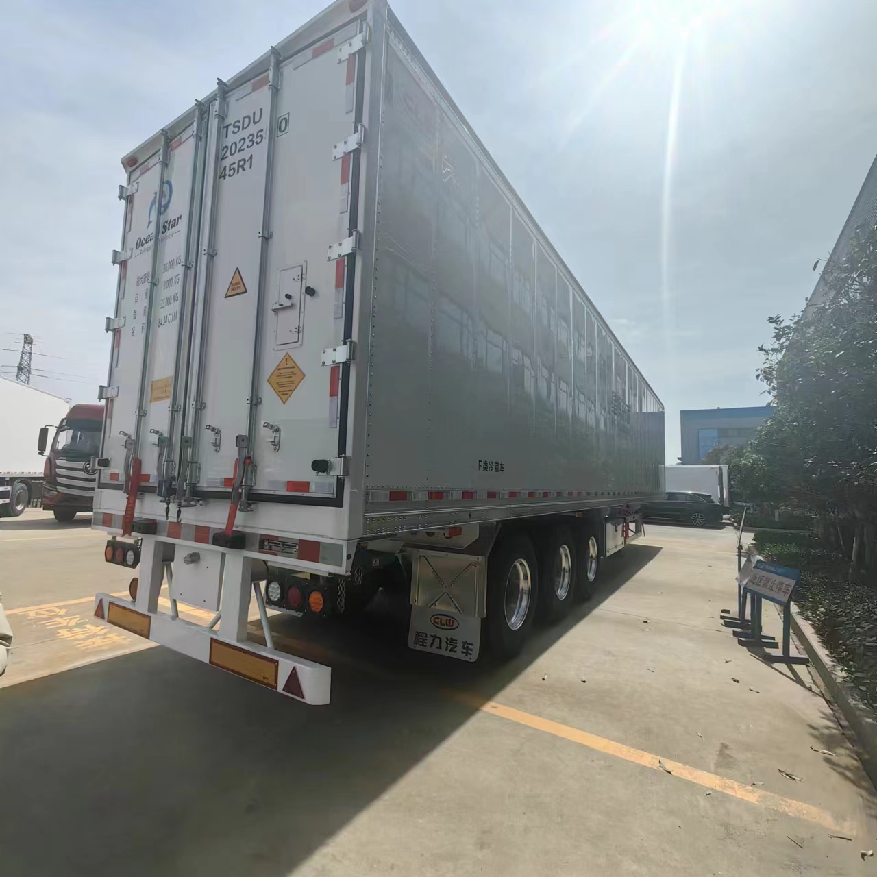 半掛出口冷藏車選用的是富華品牌的ABS,行走部分牽引銷可選裝90和50,成山12R22.5輪胎,采用的是輕量化鋼圈,帶緊急制動閥,配備鋁合金鋼圈,貨箱尺寸:12970*2440*2450mm,該車箱體采用的是外全鋁蒙皮,內熱縮板,帶聚氨酯發泡工藝,左右側板8公分厚,底板12公分厚,底板加厚通風槽,廂體內部頂板加裝通風布,前后通風器,四個頂燈,冷機護板,單側門,左右兩側30公分護板(圍裙),兩個排水孔,后門上車爬梯,大包邊,后門雙鎖桿,不銹鋼門框其他按半掛標準。