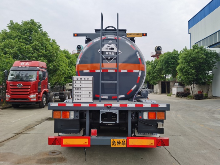 拉硫酸專用腐蝕品半掛車顏色可以多選,可選灰色防腐漆或者銀色等多種顏色,該車按照標配貼反光條,貼反光帶,安全告示。介質:硫酸。想要拉硫酸不超重,又能滿足公告的,這一款車更合適,讓您用車更無憂!
