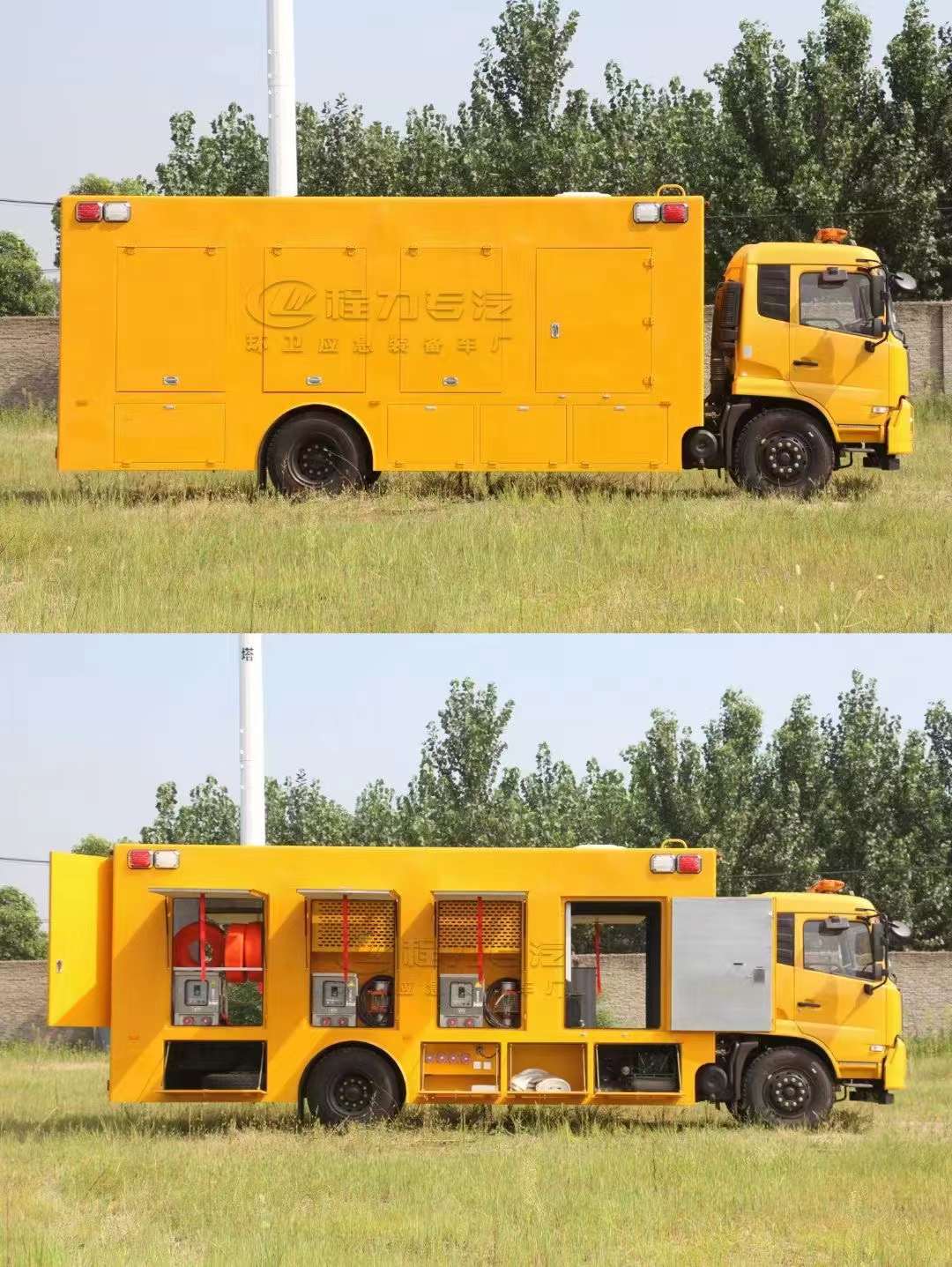 東風天錦3000立方救險排澇車,底盤配備康明斯230馬力發動機,上裝配備150千瓦發電機組,同時配6臺便攜式高速潛水泵,單臺水泵流量可達500m³/小時,總流量3000m³/小時,揚程10米,每臺泵配2根20米長 直徑20厘米的排水管。排澇車一般多用于梅雨季節汛期防汛的緊急搶險排澇,效果非常顯著,其優點排水量大、速度快,有效解決汛期難題。