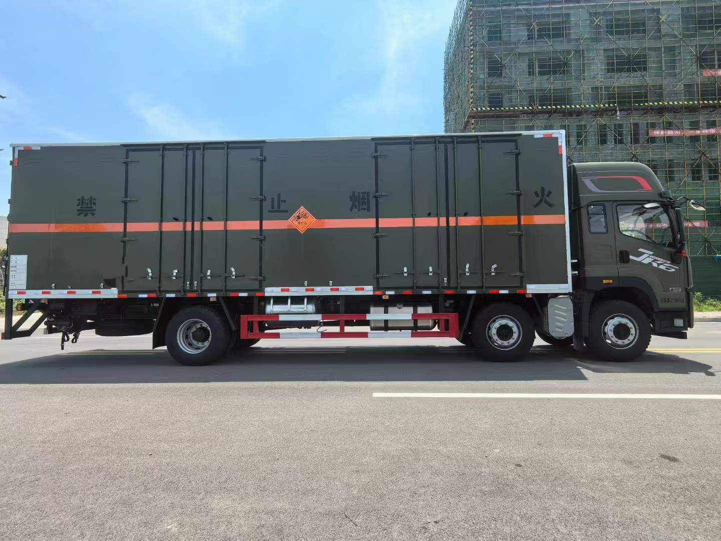 解放JK6三軸國六玉柴300馬力爆破運輸車選用的是危化品專用底盤,玉柴300馬力發動機,陜齒沈8檔變速箱,公告型號:QYY5120XQYCA6,箱內尺寸:9600*2450*2600mm,額載質量:9995kg,定制的是JK6高頂全浮駕駛室(雙臥鋪/空調/電動門窗),選用的是玉柴YCS06300-61A,陜齒8JSX110TC,435升級沖焊橋(速比4.444/楔式制動),270*75*7,295/80R22.5-18PR,爆破器材車專用底盤,視頻記錄儀,空氣彈簧座椅,帶中間座椅,中控鎖,巡航系統,危化品標志燈,前橋爆胎應急安全裝置,前橋帶胎壓監測,排氣火花熄滅器,排氣管前置,帶發動機缸內制動,帶轉向應急,板簧3/3/2+-,2氣囊,帶國產ECAS,二軸帶橫向穩定桿,300L鋁油箱,ETV閥,U型后處理器,鐵儲氣筒,150Ah蓄電池,帶靜電拖地帶,機箱橋換油,6/6/6萬公里,PKC線束,限速79KM/H,進口EBS/ESC/FCW/LDWS