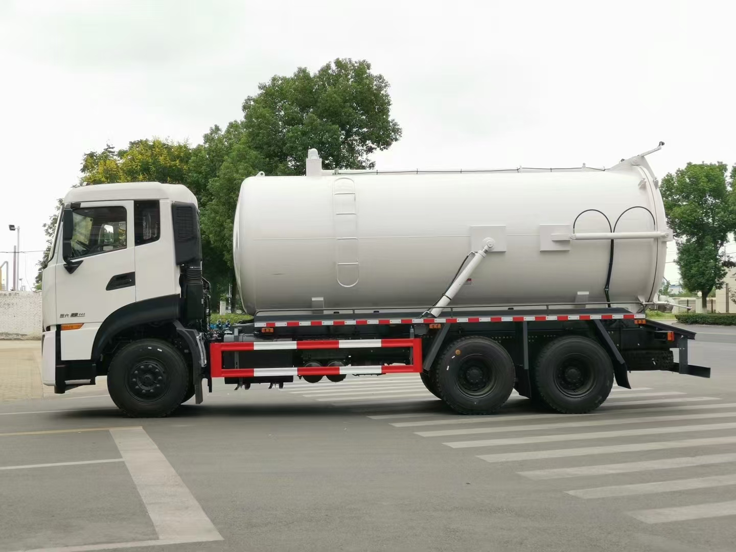 東風天龍后雙橋國六18立方吸污車采用的是白色天龍KL排半平頂駕駛室,6×4驅動,軸距4350+1350mm,四點懸浮,司機減震座椅,原廠空調,電動玻璃,中控鎖,遙控鑰匙,行駛記錄儀,龍擎340馬力發動機,法士特9檔變速箱,5.5T前橋,10T后橋,300雙層車架,11.00R20鋼絲胎,自動調整臂,斷氣剎,ABS。