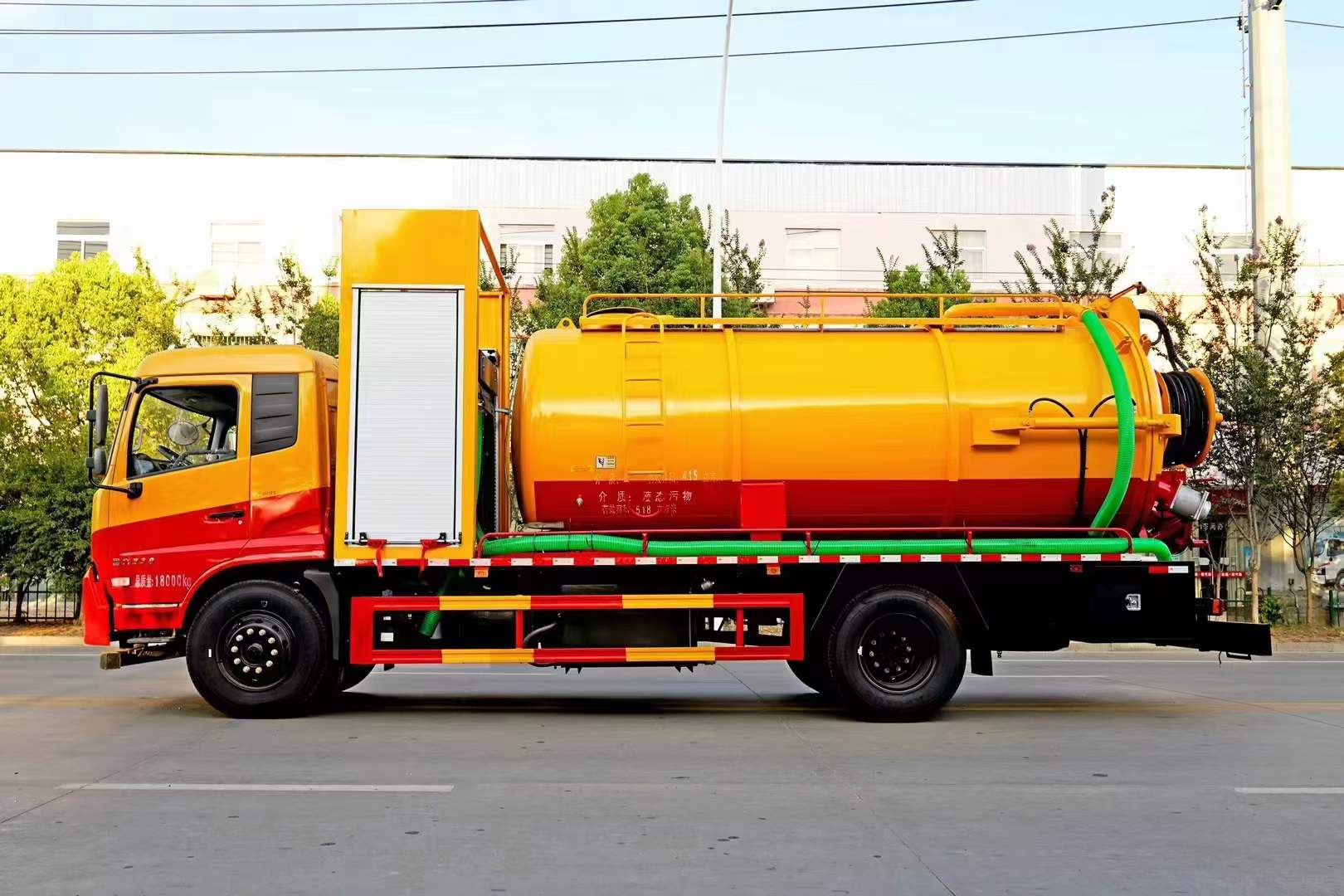 東風(fēng)天錦15方清洗吸污車整車型號(hào):CL5180GQW6CC,軸距4700mm,采用的是康明斯230馬力發(fā)動(dòng)機(jī),罐體容積約15方,8m碳鋼板材,清水約4方,清水箱兩側(cè)一邊一個(gè)消防栓進(jìn)水口,清水罐底部一個(gè)65排水閥,安裝視糞管,罐頂一個(gè)排氣閥,其余為吸污,罐頂兩個(gè)罐口(帶爬梯),兩倉球閥互通,罐頂一個(gè)互通。兩倉中間用封頭8mm,品孚350流量高壓,清洗泵60米25高壓管,卷盤裝后封頭180度旋轉(zhuǎn),卷盤帶液壓旋轉(zhuǎn)。濰柴375馬力副發(fā)機(jī)組帶30水循環(huán)泵,吸污管道帶排氣閥。不開大蓋后封頭上安裝一個(gè)600水泥蓋放污可液壓開啟,一個(gè)150球閥,兩個(gè)100球閥,副駕一個(gè)150偷排,罐體尾部箭頭燈,帶一個(gè)視污窗口,后封頭一個(gè)視糞管,一個(gè)工具箱兩層,帶一根8米吸污管。其余廠內(nèi)標(biāo)配。