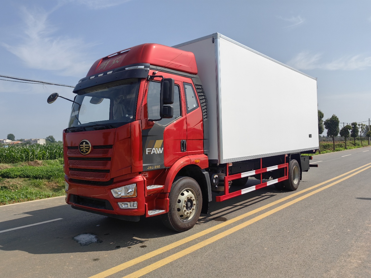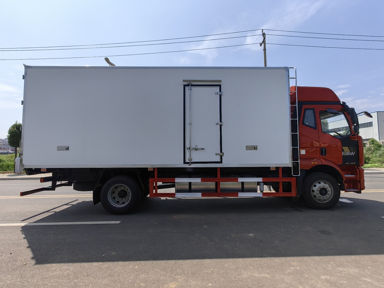 解放J6L國六300馬力6.8米冷藏車箱體采用內(nèi)外玻璃鋼板,中間8cm厚高密度保溫板,底板采用下沉式滿焊通風槽,箱內(nèi)前板+側(cè)板30cm高鋁型材踢腳線,箱體外部鋁型材包邊,不銹鋼門框、門鎖件,5層結(jié)構(gòu)密封條,單開側(cè)門,大工具箱,安裝國產(chǎn)S1100制冷機組,帶冷機檢修爬梯,后雙開門