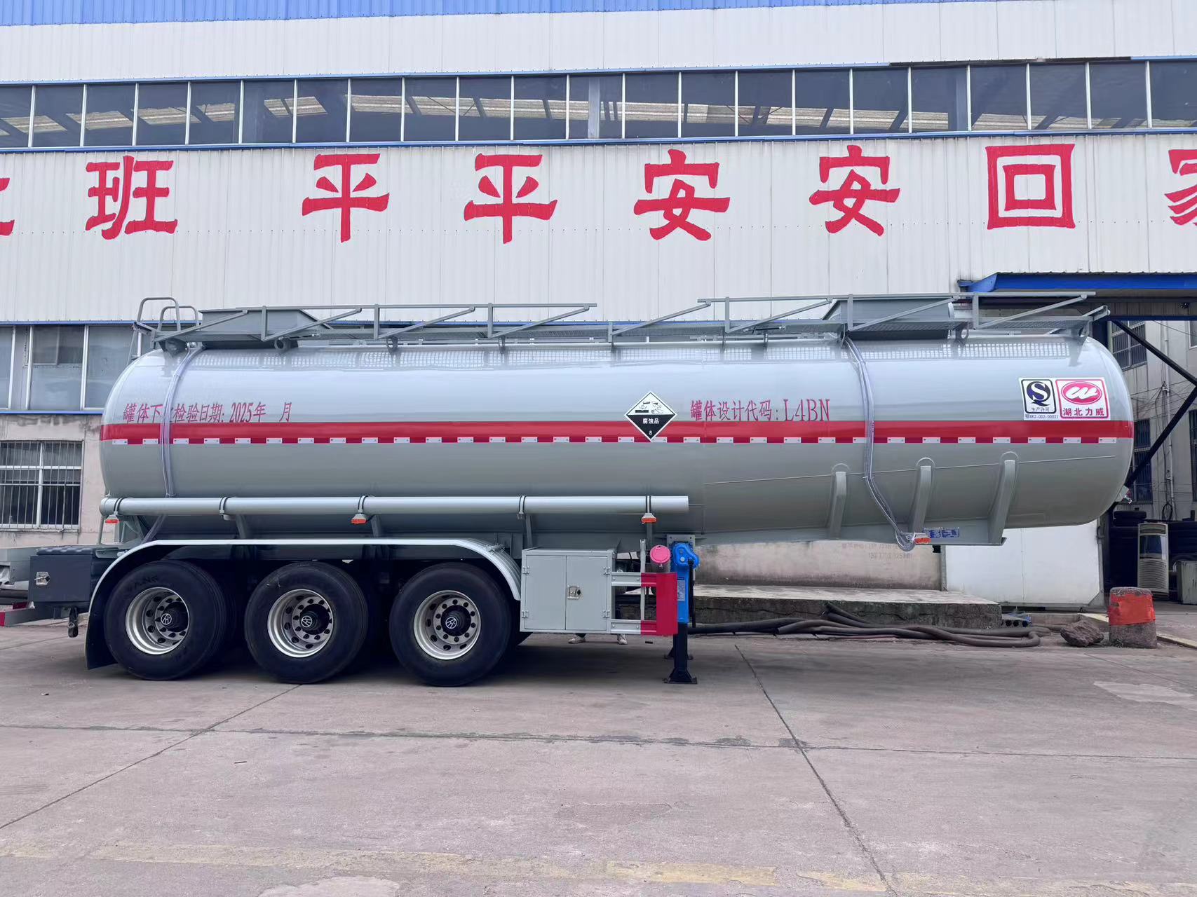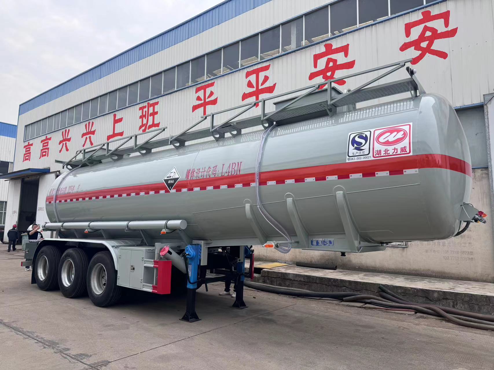 拉鹽酸專用分體式腐蝕品罐式車罐體總容量:28.19立方,額定載質量31150KG,外罐體材質為Q235B型4.2mm厚板材,封頭4.5mm厚,罐體通倉,內襯20mm厚聚乙烯,三道雙層鋼襯塑防浪板,兩個鋁合金歐標罐口蓋,罐口周圍用方盒子式圍邊,圍板內做防腐處理,罐體頂部帶活動舉升護欄,玻璃鋼方格走道,罐體尾底部帶一個DN100不銹鋼襯氟海底閥(海底閥帶聲光報警裝置),罐體后尾部左右各一個DN80襯氟球閥為出料口帶全塑保護箱,大梁下出料,一個工具箱,尾部爬梯。兩根卸料管,兩個8KG滅火器,其余標配。