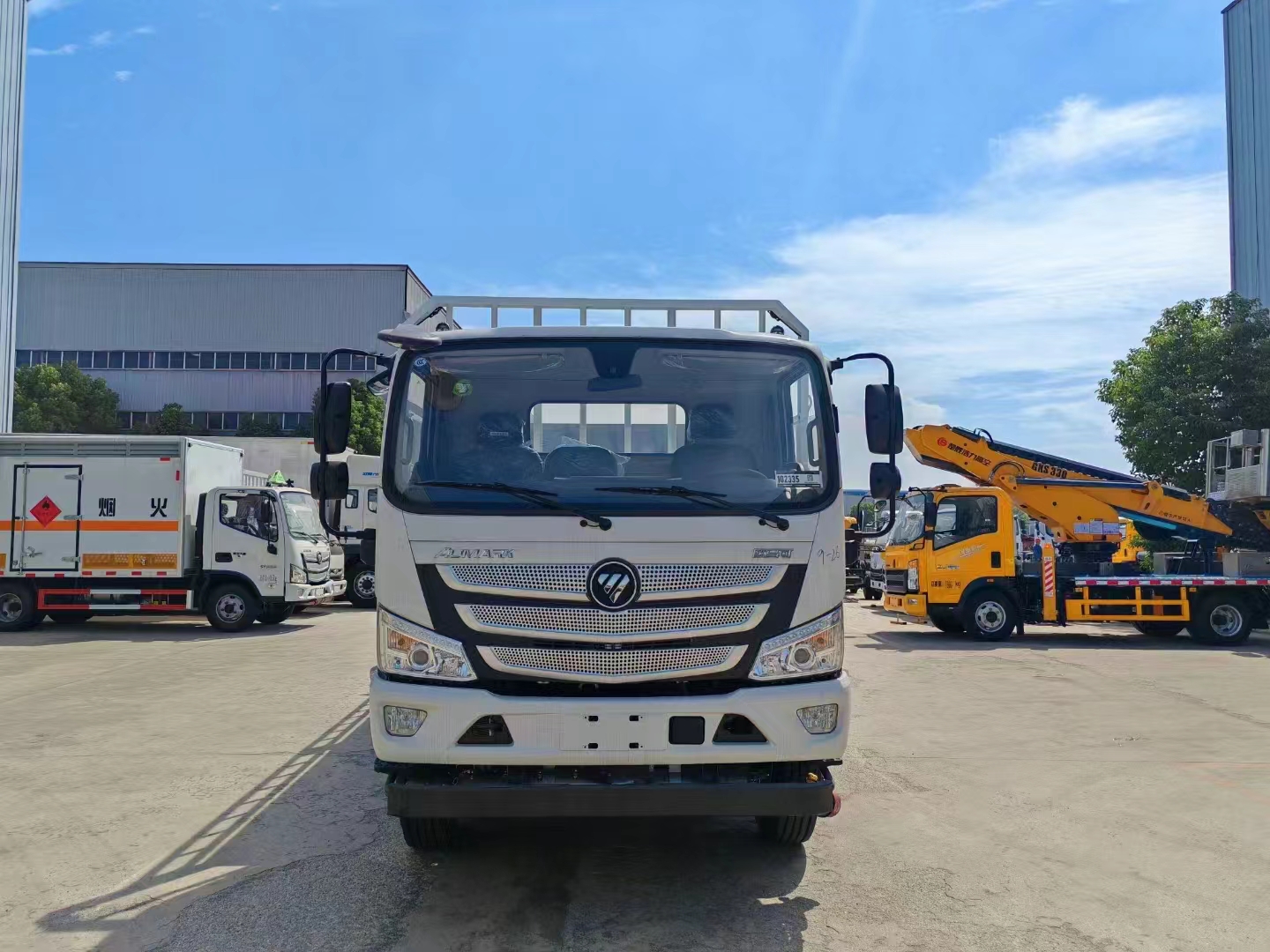 福田歐馬可國六5米1氣瓶車?yán)浒宓蠕摬暮附佣傻母邫诮Y(jié)構(gòu),高欄活動可整體拆卸,兩側(cè)欄板下翻轉(zhuǎn),后部欄板下翻轉(zhuǎn),前龍門架齊全,鋪設(shè)防靜電膠皮,廂體橙色反光帶,紅白相間反光板,菱形標(biāo)志牌,危險品牌,拖地靜電帶,安全告示,滅火器等