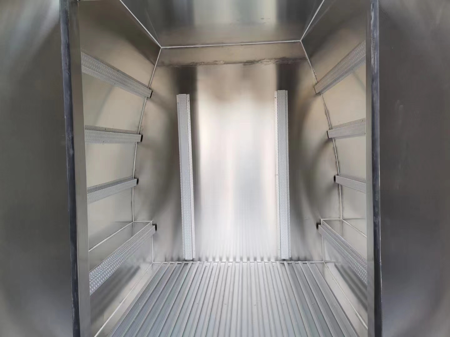疫苗冷鏈車整車廂體使用生物安全級箱體材料,即保持廂內溫度均衡,又有效抑制細菌滋生。廂體采用“三明治”式板粘接工藝:內外壁板均選用優質的機制玻璃鋼板,美觀結實;中間保溫材料選用新型80mm厚聚氨酯發泡材料,保溫性能;廂體周邊采用現代高新技術包邊,整體強度大、性能好。