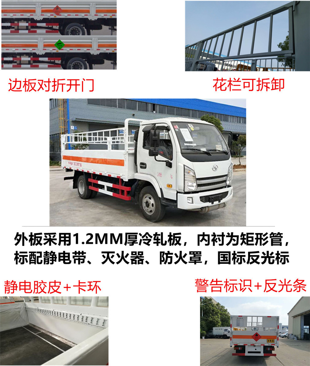 躍進依維柯高欄式氣瓶運輸車,它是根據國家有關部委對易燃氣體鋼瓶運輸的規范和用戶的要求而研制生產,產品符合國防科工委關于《氣瓶運輸車安全技術條件》的要求.具有廂體強度高、防火阻燃、防止靜電火花等主要功能.專業運輸各類氣體介質瓶裝轉運,如:液化石油氣瓶運輸車、鋼瓶配送車、煤氣瓶轉運車、氧氣瓶、二氧化碳氣瓶等。