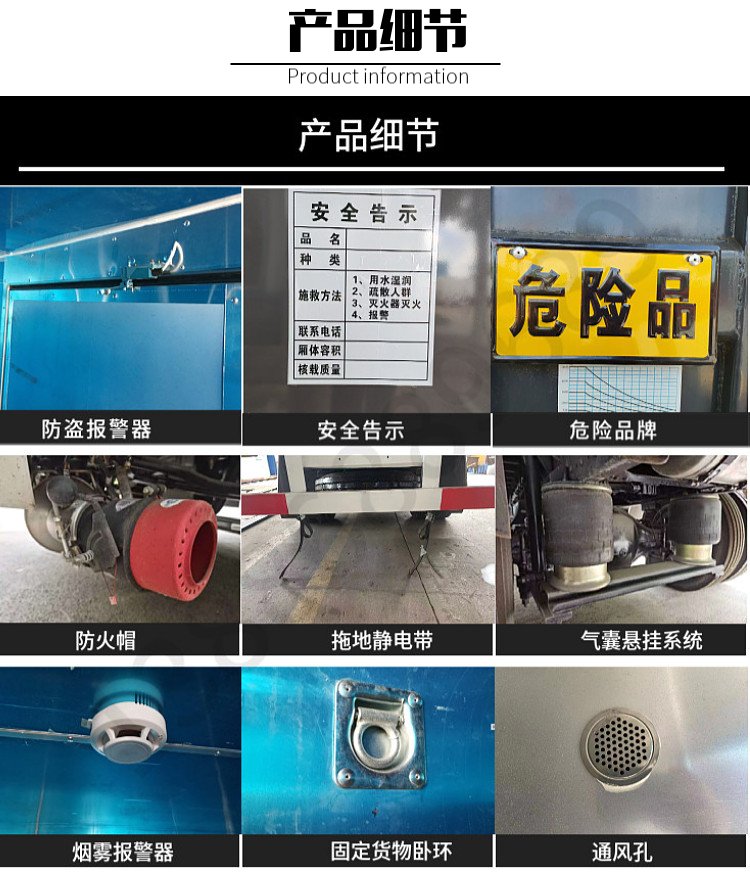 隨底盤選裝駕駛室;隨底盤選裝尿素箱安裝位置、油箱安裝位置;選裝廂體外觀,選裝無柵欄;選裝起重尾板(收起狀態水平長度為280mm),尾板質量為350kg,選裝不同廠家尾板及尾板樣式;運輸介質類項號:2.1,2.2;該車為危險品貨物運輸車;僅采用前輪盤式制動器,前置排氣管,子午線輪胎,限速裝置的底盤,限速80km/h;轉向輪安裝爆胎應急防護裝置.整備質量包括滅火器、隨車工具;貨廂重量579Kg,材質Q235,底板厚度3mm,側板厚度1mm. |