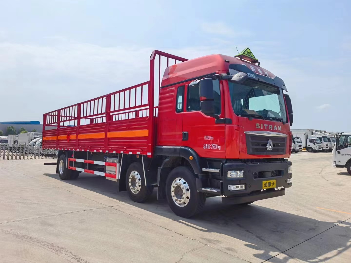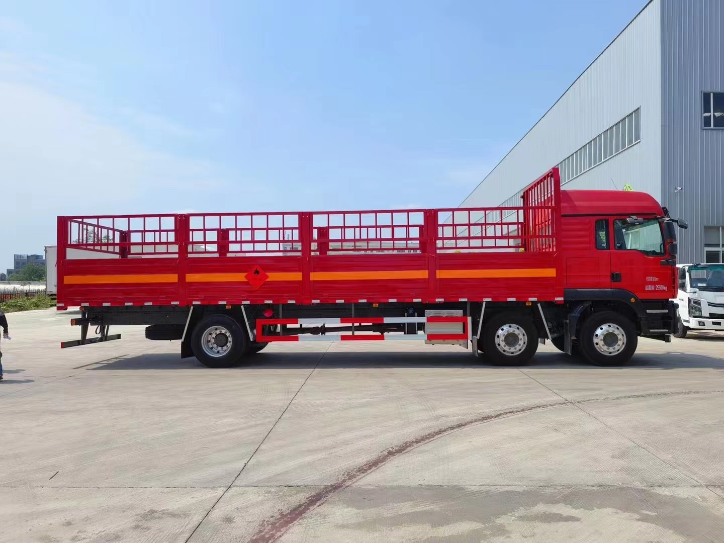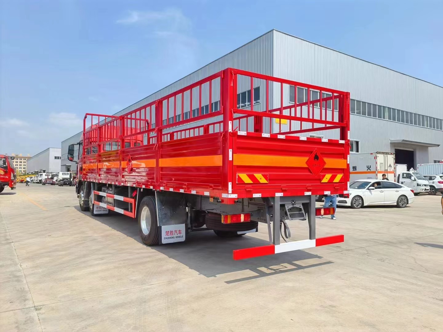 廂體邊板采用1.2mm冷板,底板標(biāo)配4mm花紋鋼板,花欄及花欄立柱可拆卸,底部立柱固定,底板上方鋪靜電膠皮,底板均做防銹處理,車(chē)廂一周粘貼橙色反光帶,箱體粘貼菱形標(biāo)志牌,安全告示牌,危險(xiǎn)品牌,拖地靜電帶。