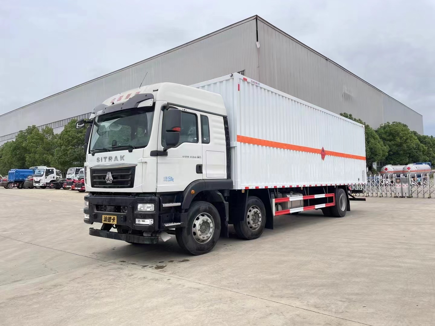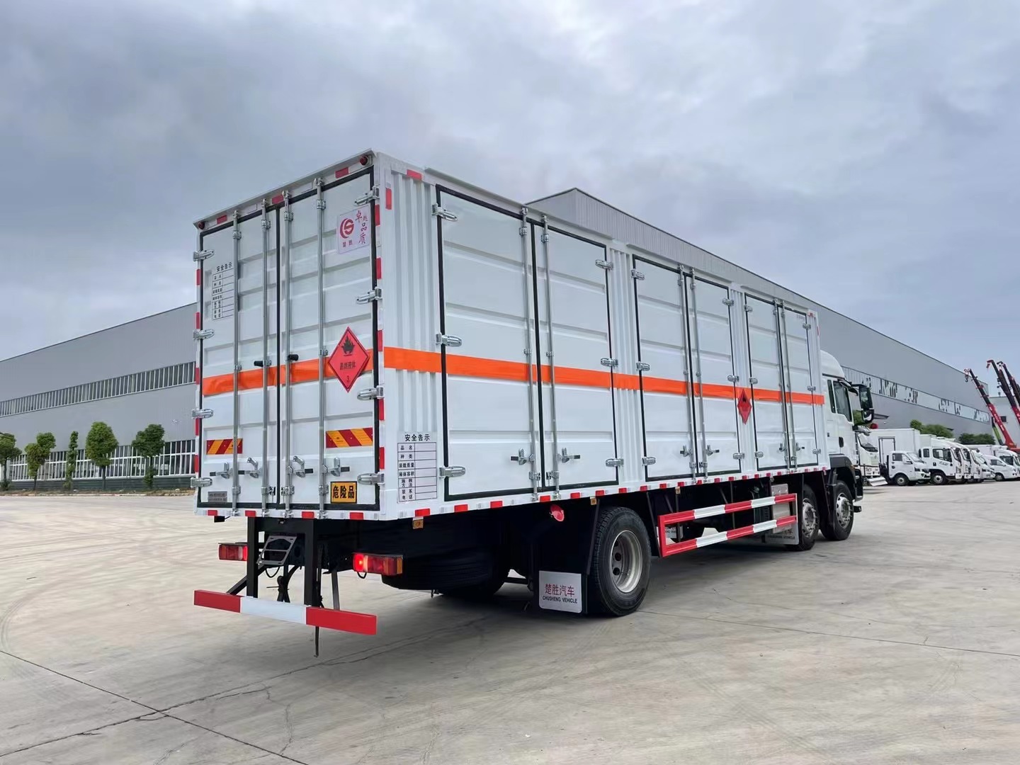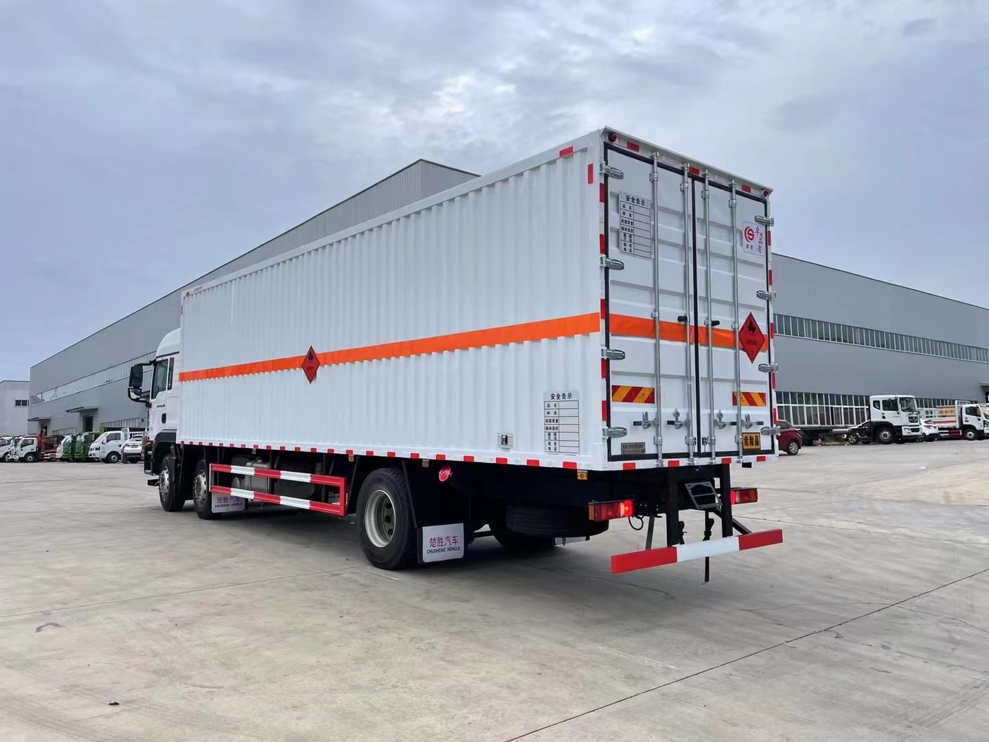 嚴(yán)格按照公告尺寸制作。外板采用烤漆板帶百葉窗,內(nèi)飾為導(dǎo)電性能良好的鋁平板有透氣孔,矩形骨架結(jié)構(gòu)內(nèi)部填充防火阻燃材料,復(fù)合加鉚合工藝。廂體四周鋁合金包邊及包角,車廂底板3mm鋪設(shè)防靜電膠皮,廂體前臉50公分高鋪設(shè)防靜電膠皮。后部設(shè)置對開門,右側(cè)單開門,廂體內(nèi)部兩側(cè)安裝捆綁貨物的臥環(huán)。廂體內(nèi)部安裝煙霧報(bào)**器及防盜報(bào)**感應(yīng)器。車廂一周粘貼橙色反光帶,箱體粘貼 菱形標(biāo)志牌,安全告示牌,危險(xiǎn)品牌,箱體安裝示廓燈(前白后紅),拖地靜電帶。