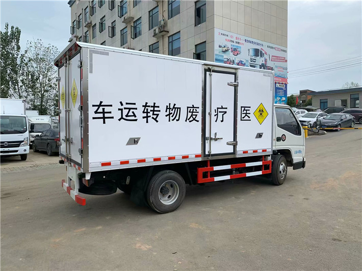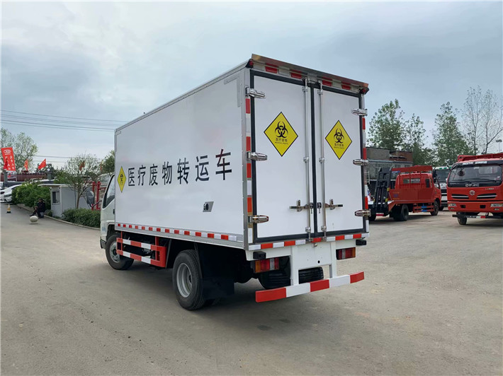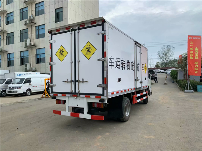 江鈴國六醫(yī)療廢物轉(zhuǎn)運(yùn)車,箱體配置:箱體采用外玻璃鋼內(nèi)不銹鋼材質(zhì)制成,5cm保溫板,箱體內(nèi)無死角,加裝噴霧消毒,紫外線滅菌燈,尾部為雙層密封門,防滲漏,污水收集箱,加裝-5度制冷機(jī)組。