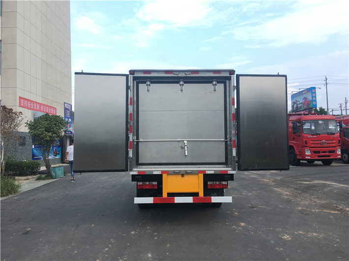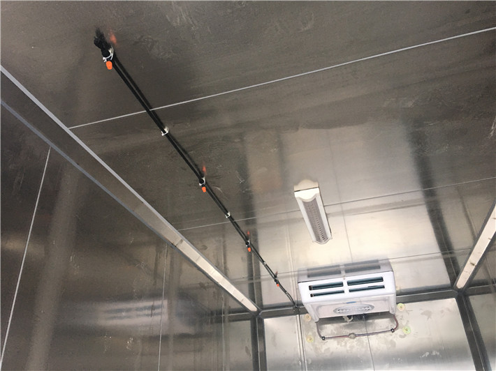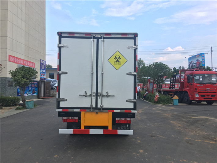 箱體采用外玻璃鋼內(nèi)不銹鋼材質(zhì)制成,箱體內(nèi)無死角,加裝噴霧消毒,紫外線滅菌燈,尾部為雙層密封門,防滲漏,污水箱,加裝-5度制冷機(jī)組,低溫消毒。