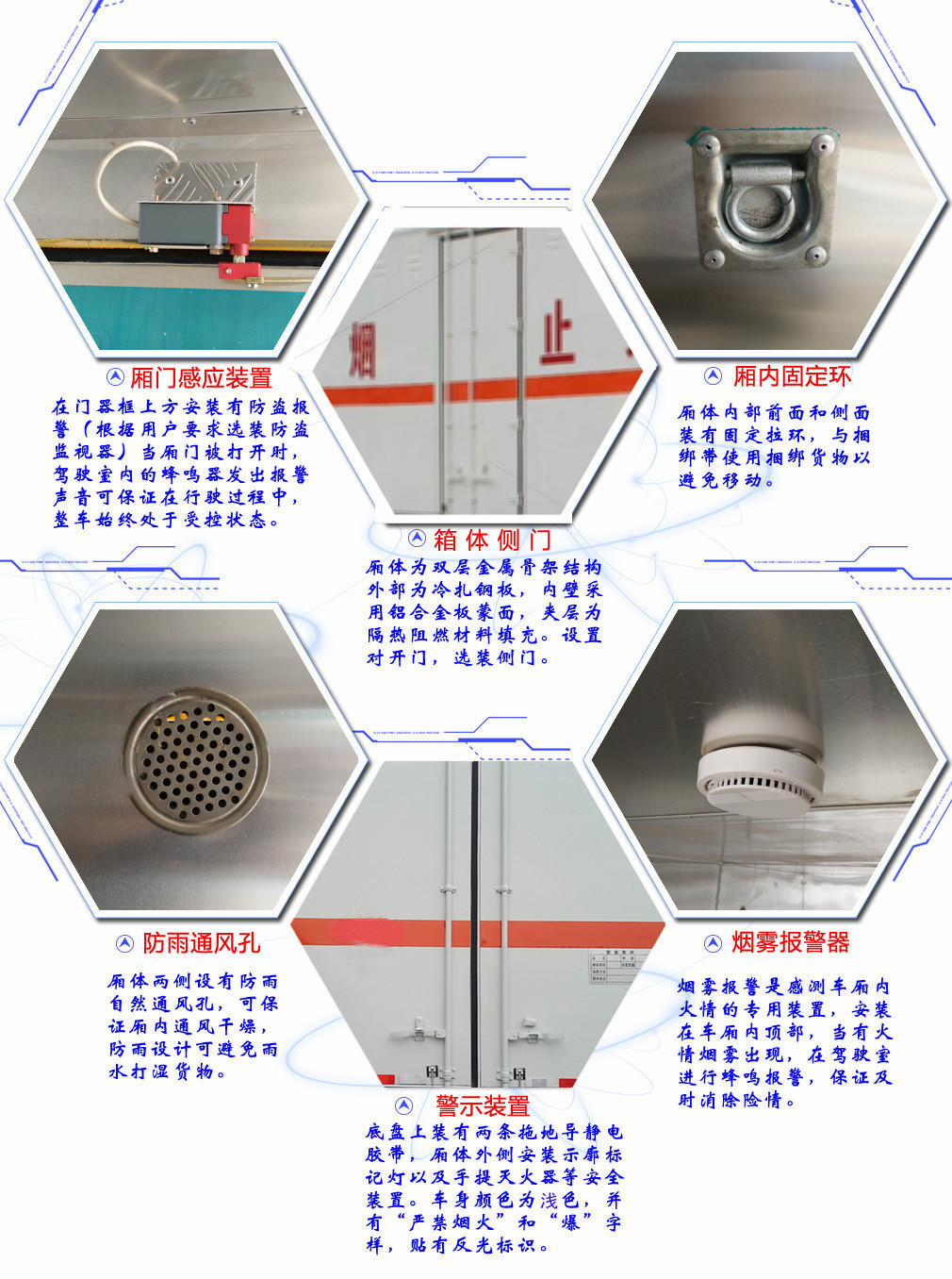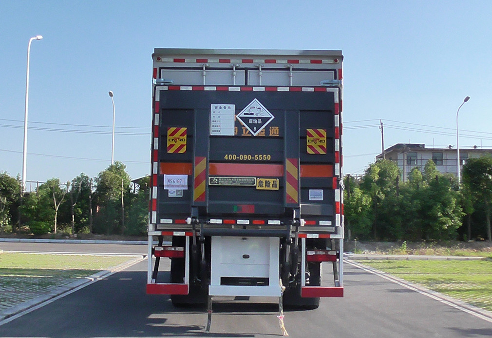 該車為危險品運輸車。該車頂部封閉,不可開啟.隨底盤選裝高頂駕駛室、選裝氣喇叭,遮陽罩,綠色濾光帶,踏步,選裝鋁合金油箱.運輸具有獨立容器包裝的腐蝕性物品,危險貨物類項號:8。