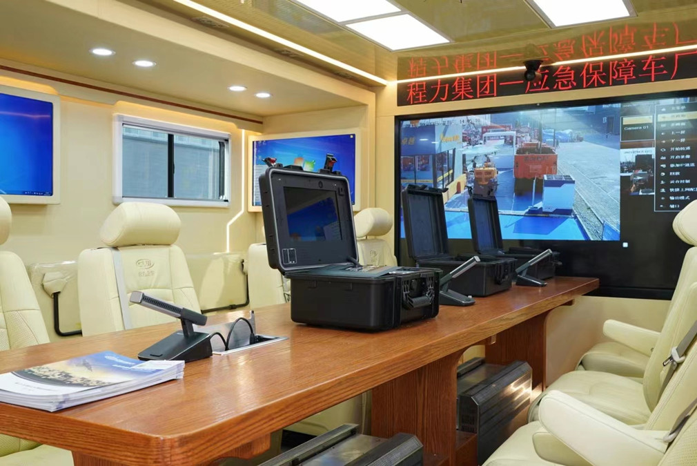 采用重汽豪沃4×2底盤,車輛長度10630mm;車內配備9人會議桌椅,另配6個壁掛式折疊桌椅,廂體前面發電機倉與會議室隔開,廂體尾部為控制室。廂體按空間區域分為前壁艙,乘、住區,衛生間。廂體采用聚氨酯發泡技術制作的保溫廂體,外蒙皮為1.5mm厚防銹鋁板、內蒙皮為1.5mm防銹鋁板。對于有懸掛裝置要求的廂板,在相應位置增加預埋和支撐。內粘波音軟片,整個底部墊有麻灰色塑膠地板,結實 前壁艙內放置地板蓋板,滅火器等配件;乘、住區在中部擴展位,中間固定床設置在主廂體上,折疊床在左、右廂體上;左、右廂體前部各掛19寸車載液晶電視一臺 衛生間在后部,頂部安裝天窗、換氣裝置;主廂體頂部設有空調,沿頂部送風管道向廂體各處送風。各風口安裝雙眼布風器,可調節風量及角度;主廂體頂部設置衛星接收天線;整車設置3個單開門,800× 1800鋁合金后門1套、小廂575*1750房車門2套,左、右廂體兩側安裝鋁合金推拉窗共6(1000*600)扇,內側安裝窗簾。廂體后部設置可折疊蹬頂梯通向車頂,廂體頂部粘接防滑粘。